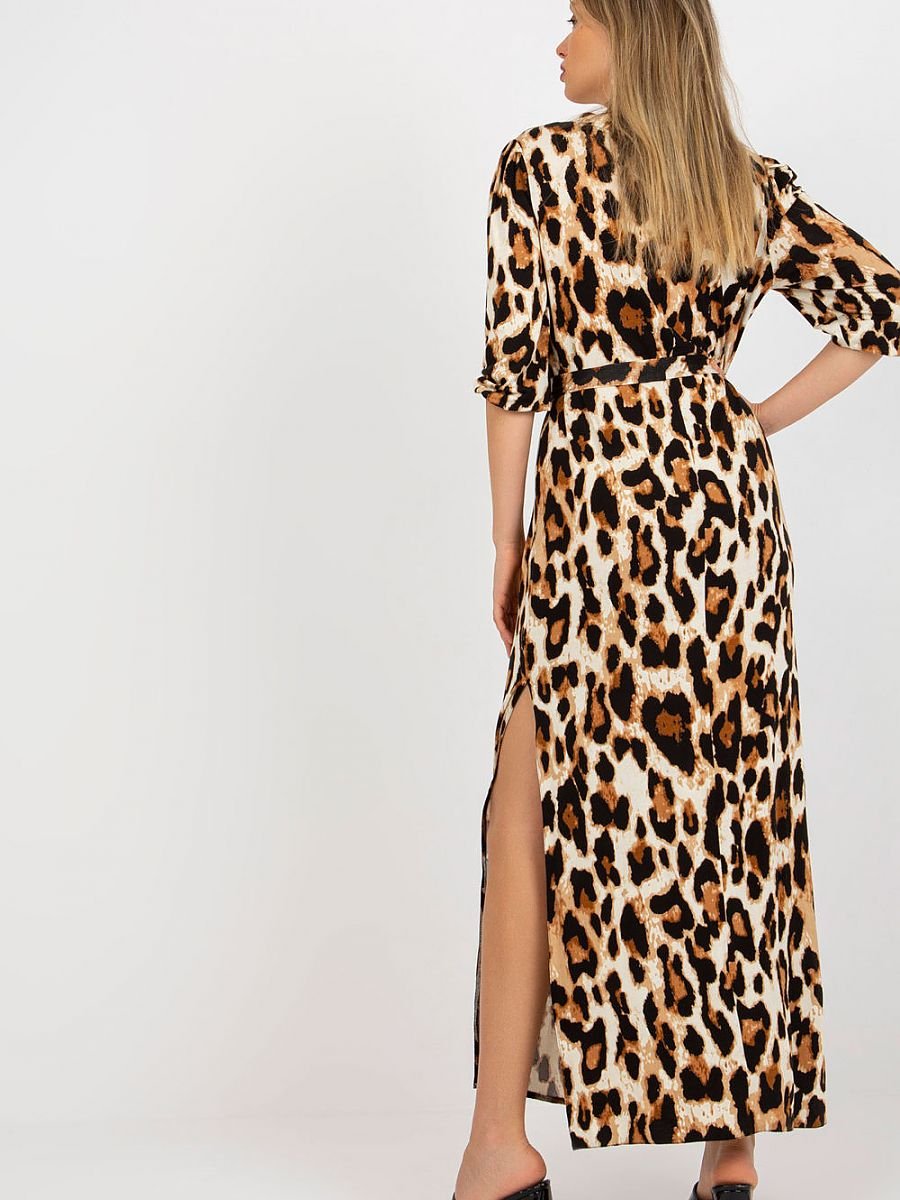 Długa sukienka z rękawem 3/4 oraz dekoltem w serek. U dołu swobodne rozcięcia, do kompletu pasek do wiązania.