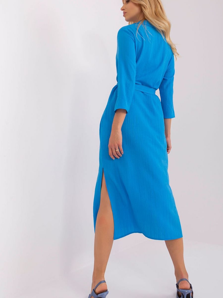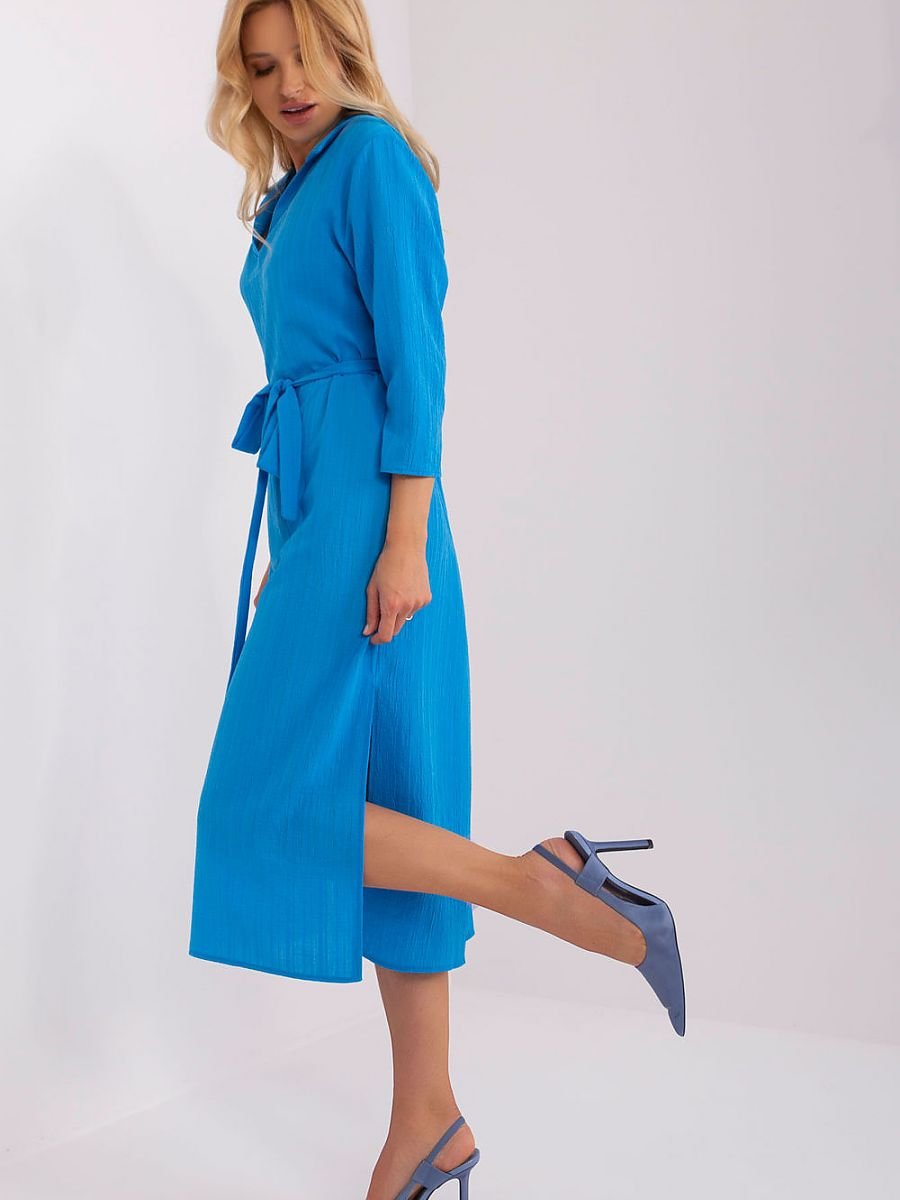 Sukienka o prostym kroju z rękawem 3/4, wiązaniem w pasie oraz rozcięciami po bokach. Propozycja na co dzień i nie tylko.