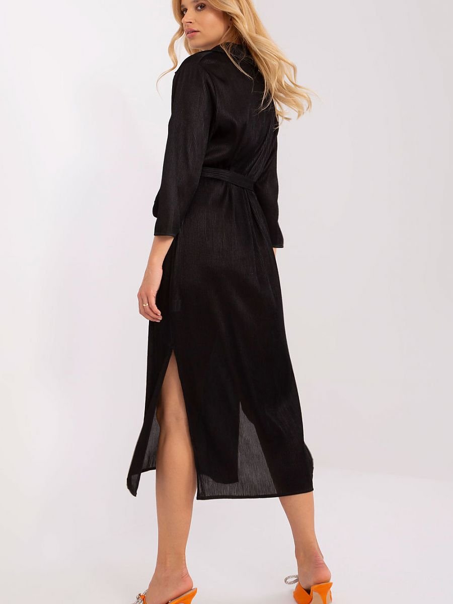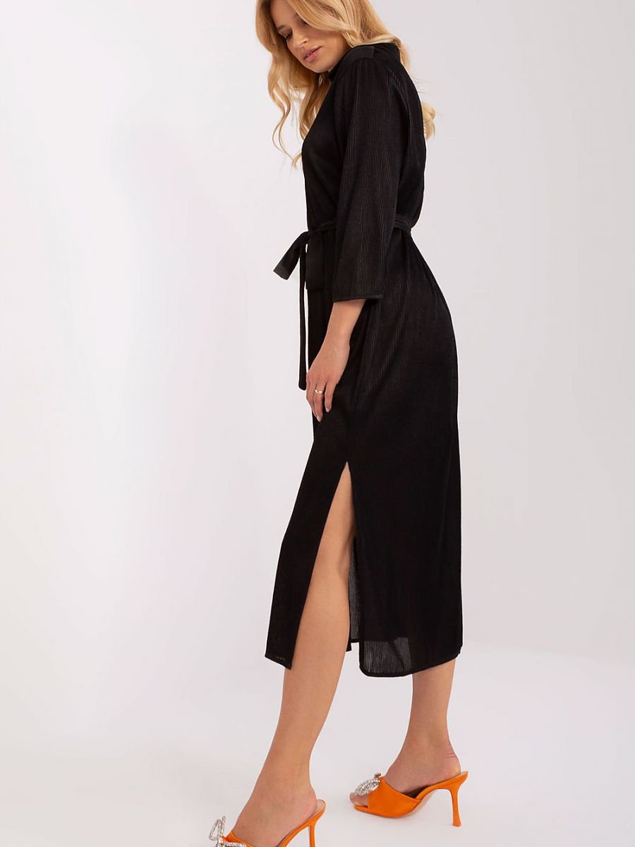 Sukienka z rękawem 3/4, kołnierzykiem oraz dekoltem w serek. W pasie wiązanie, u dołu rozcięcia. Sukienka wykonana z prążkowanej tkaniny.