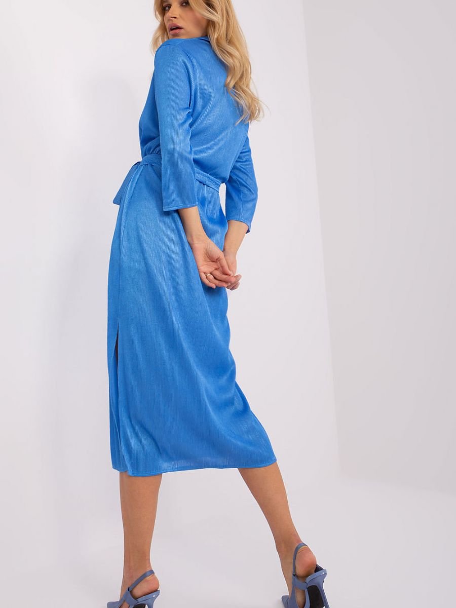 Sukienka z rękawem 3/4, kołnierzykiem oraz dekoltem w serek. W pasie wiązanie, u dołu rozcięcia. Sukienka wykonana z prążkowanej tkaniny.