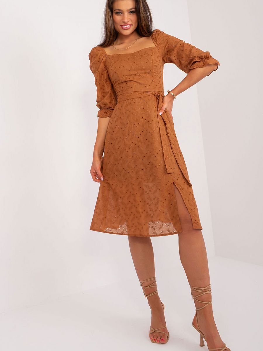 Ta letnia sukienka emanuje świeżością i lekkością, idealną na codzienne noszenie podczas ciepłych dni. Jej fason rozkloszowany dodaje jej uroku i sprawia, że jest wygodna w noszeniu, pozwalając skórze oddychać. Wykonana z przewiewnej bawełny, sukienka gwarantuje komfort noszenia nawet w najgorętsze dni. Jej długość midi nadaje eleganckiego wyglądu, jednocześnie zachowując swobodę ruchów. Krótkie rękawy z delikatną falbanką dodają lekkości i delikatności całej stylizacji. Prostokątny dekolt podkreśla szyję i dodaje subtelności. Sukienka jest zapinana na kryty zamek, co zapewnia łatwe zakładanie i zdejmowanie. Delikatny haft ozdobny na materiale dodaje jej wyjątkowego uroku i sprawia, że z łatwością przyciąga spojrzenia. Dodatkowo sukienka posiada podszewkę, co zapewnia dodatkowy komfort noszenia i zapobiega prześwitom. Bufiaste rękawy dodają romantycznego akcentu i sprawiają, że cała stylizacja nabiera lekkości i wdzięku. Pasek do wiązania podkreśla talię, dodając sukience kształtu i elegancji. To doskonały wybór na letnie spacery, spotkania ze znajomymi czy wieczorne wyjścia, gwarantując jednocześnie wygodę i styl.