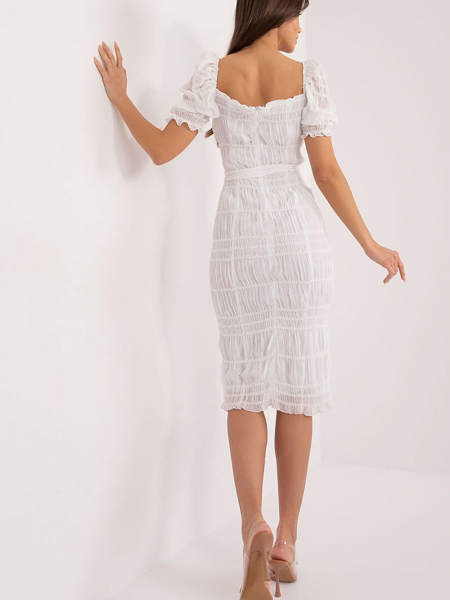 Sukienka ołówkowa, która wyróżnia się elegancją i szykiem, idealna na imprezowe okazje. Jej urozmaicona faktura materiału nadaje całej sukience unikalny charakter, przyciągając uwagę swoim wyjątkowym wzorem. Wykonana z połączenia bawełny i nylonu, sukienka zapewnia nie tylko doskonały wygląd, ale także komfort noszenia i elastyczność. Średnia długość midi nadaje sukience klasy i ponadczasowego wyglądu, doskonale pasując do różnych sylwetek. Prostokątny dekolt dodaje sukience elegancji i subtelności, podkreślając szyk i styl użytkowniczki. Zapięcie na kryty zamek umieszczone z tyłu sukienki zapewnia łatwe zakładanie i dopasowanie do figury. Bufiasty krótki rękaw dodaje sukience oryginalności i modnego wyglądu, nadając jej lekkości i dziewczęcego uroku. Dodatkowo, sukienka wyposażona jest w pasek do wiązania, który podkreśla talię i dodaje sukience elegancji. Falbana przy rękawkach oraz u dołu sukienki dodaje jej subtelności i delikatności, nadając całości lekkości i finezji. Ta urokliwa sukienka ołówkowa będzie doskonałym wyborem na każdą imprezową okazję, sprawiając, że jej nosicielka będzie czuła się wyjątkowo i pełna pewności siebie.