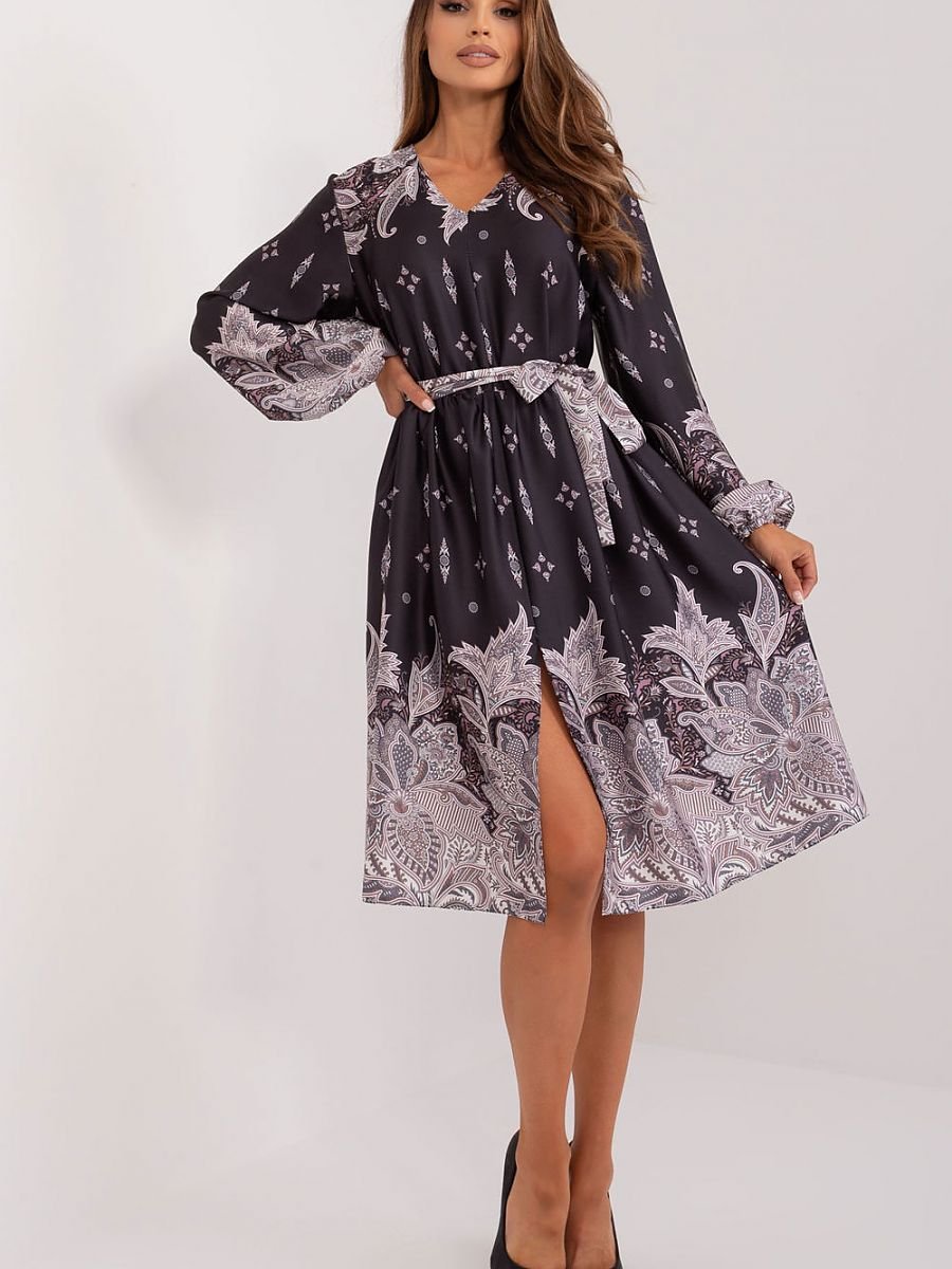 Sukienka koktajlowa o eleganckim wyrazie, idealna na wiele okazji, od pracy po spotkania biznesowe. Jej klasyczny fason, z długim rękawem i rozkloszowanym dołem, nadaje jej subtelności i wyjątkowego uroku. Świetnie sprawdzi się zarówno na spotkaniach biznesowych, jak i w bardziej formalnych sytuacjach. Sukienka wyróżnia się ciekawym nadrukiem, który dodaje jej charakteru i oryginalności, podkreślając jednocześnie indywidualny styl noszącej. Głównym materiałem używanym do jej produkcji jest połączenie bawełny i nylonu, co zapewnia komfort noszenia oraz trwałość materiału. Długość midi nadaje sukience elegancji i klasy, podkreślając kobiecą sylwetkę. Dekolt w serek jest subtelny i kobiecy, dodając sukience delikatności i wdzięku. Dodatkowo, sukienka została wyposażona w podszewkę, co zapewnia jej lepsze dopasowanie i wygodę noszenia. To idealny wybór dla kobiet ceniących sobie elegancję, komfort i indywidualny styl.