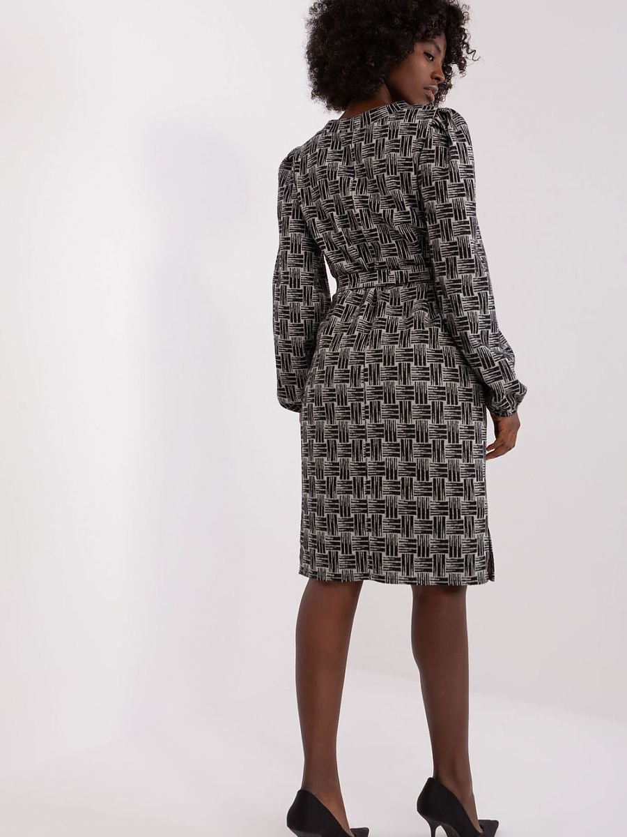 Sukienka o prostym kroju z bufiastymi rękawami oraz dekoltem w serek. Sukienka wykonana z materiału w geometryczny wzór, do kompletu pasek do wiązania.