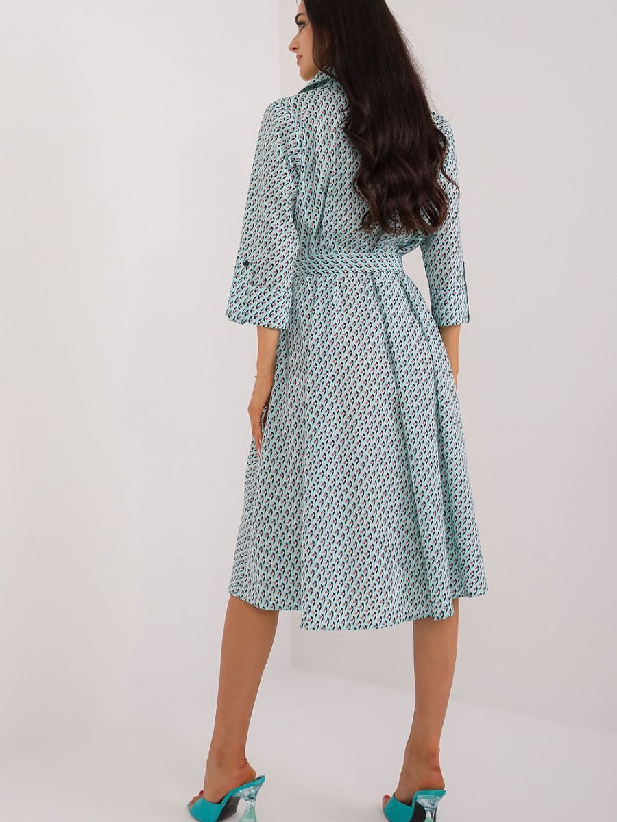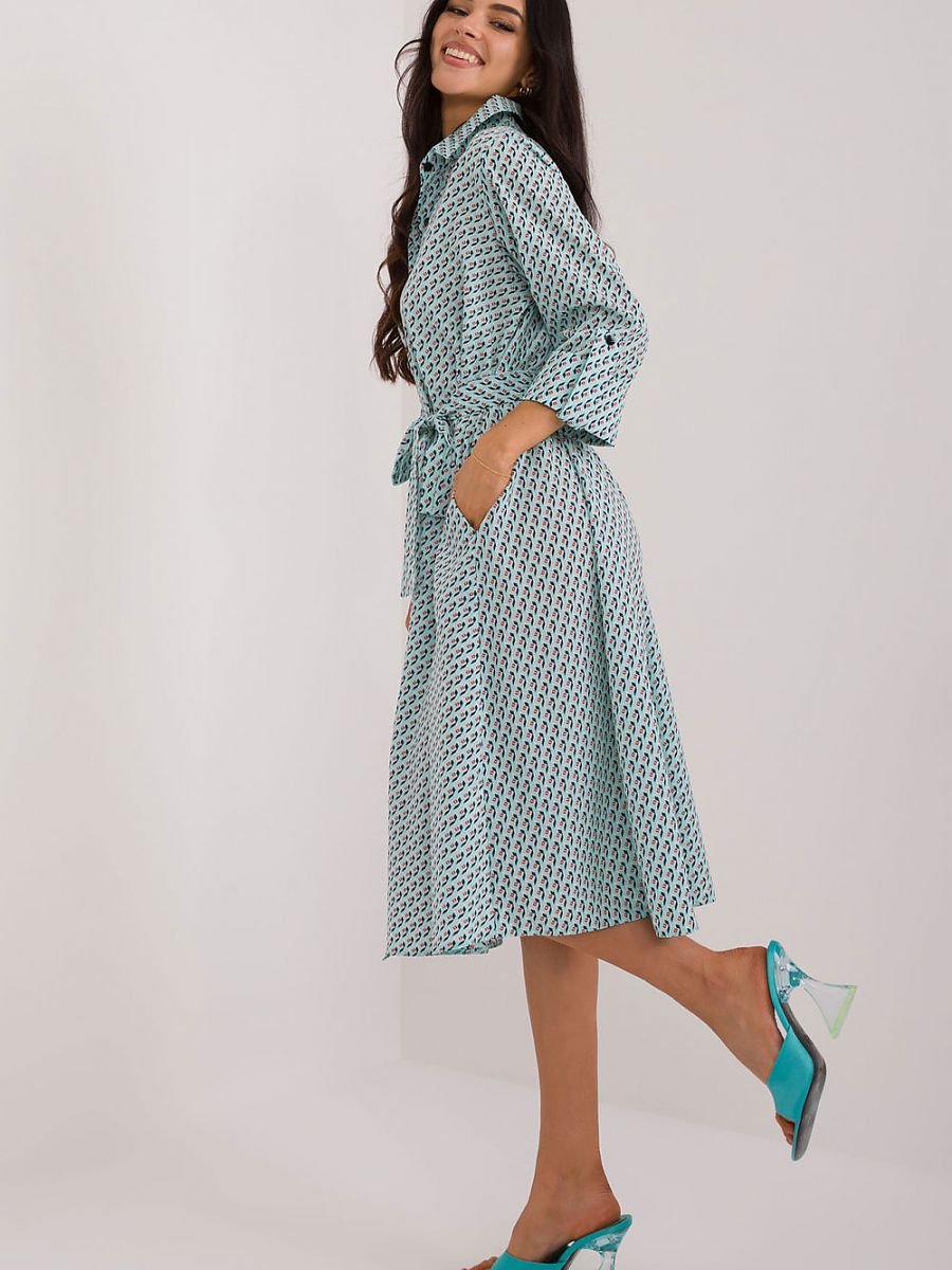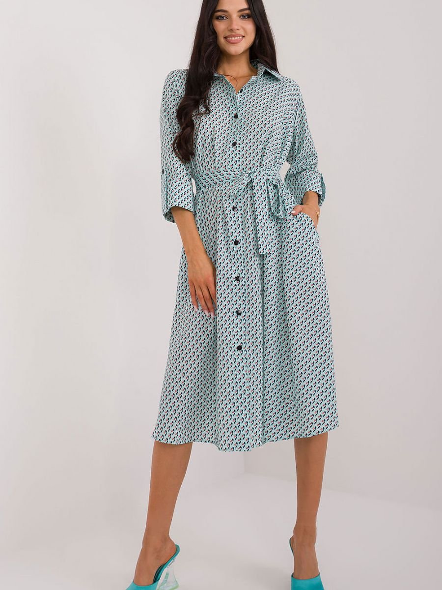 Sukienka koszulowa idealna na co dzień i do pracy. Jej rozkloszowany fason i długość midi sprawiają, że jest komfortowa i elegancka. Stonowany nadruk oraz główny materiał poliester, nadają jej uniwersalny charakter. Rękawy 3/4 i kołnierzyk dodają klasy, a guziki oraz pasek do wiązania podkreślają kobiecą sylwetkę. Dodatkowo, wsuwane kieszenie sprawiają, że sukienka jest praktyczna i funkcjonalna na co dzień.