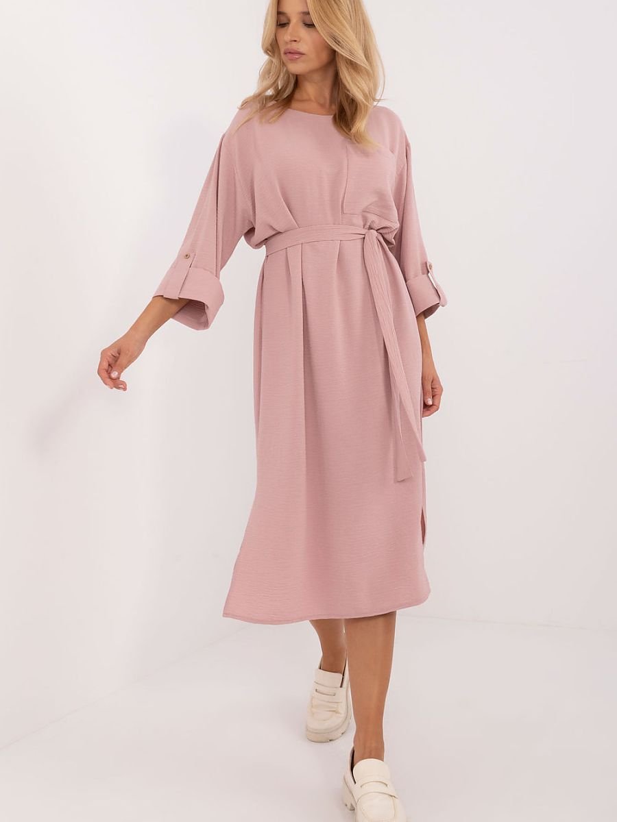 Prosta sukienka codzienna o długości midi, wykonana z połączenia bawełny, wiskozy i elastanu, zapewnia komfort i swobodę ruchów przez cały dzień. Gładka tkanina nadaje jej uniwersalny charakter, a praktyczny pasek do wiązania pozwala podkreślić talię. Model z okrągłym dekoltem, rękawem 3/4 z możliwością podpięcia oraz kieszenią na wysokości piersi łączy funkcjonalność z casualową elegancją. Po bokach u dołu znajdują się rozcięcia, które dodają lekkości i ułatwiają poruszanie się. Idealna do pracy oraz na codzienne wyjścia.