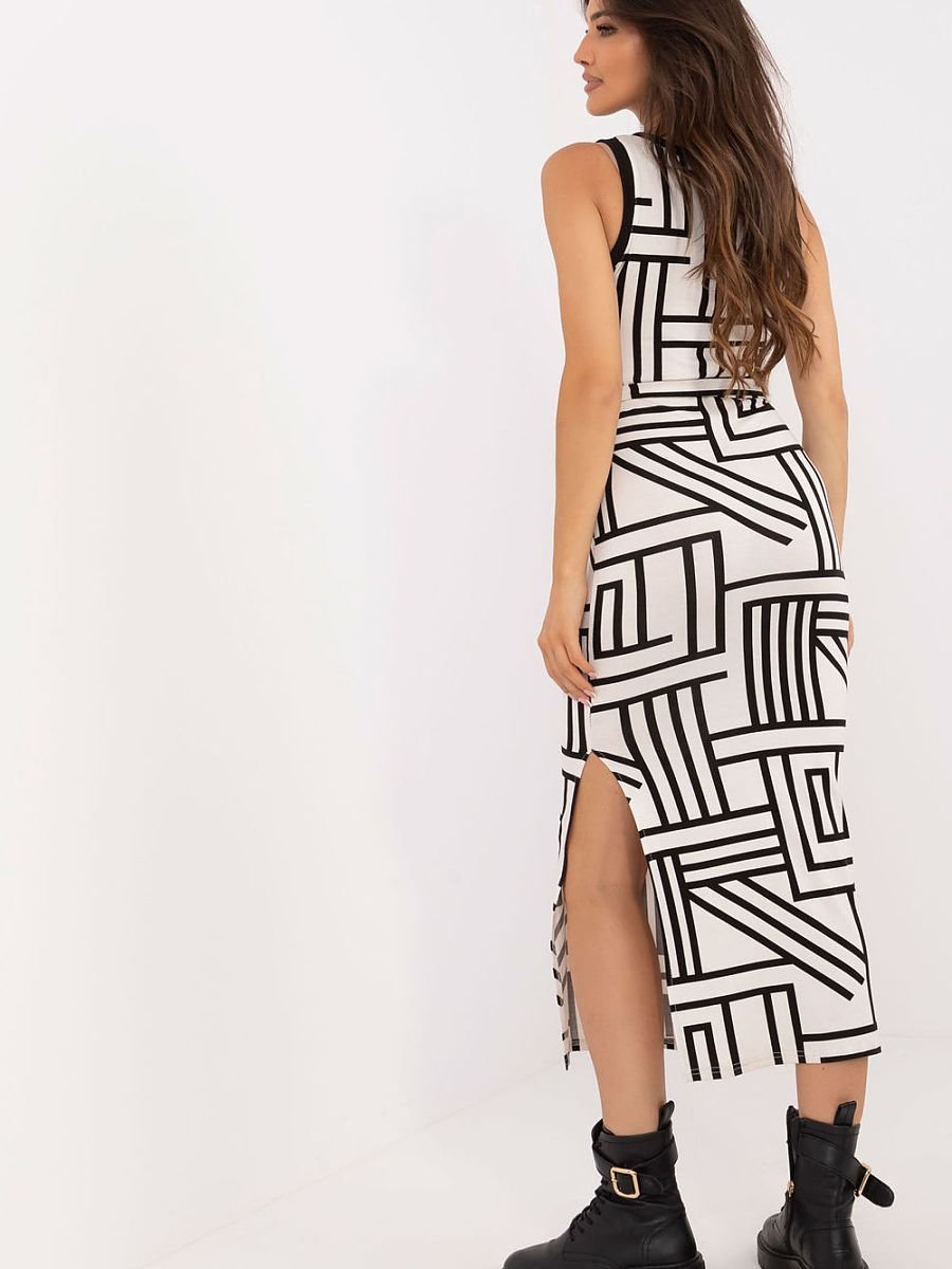 Codzienna sukienka ołówkowa o długości midi to stylowa i wygodna propozycja na każdy dzień. Wykonana z miękkiej, elastycznej mieszanki wiskozy i elastanu, doskonale dopasowuje się do sylwetki, zapewniając komfort noszenia. Model bez rękawów z kobiecym dekoltem w serek subtelnie podkreśla linię szyi i ramiona. Geometryczny wzór dodaje nowoczesnego charakteru, a dołączony pasek do wiązania w talii akcentuje kobiece kształty. Brak zapięcia sprawia, że sukienka jest łatwa do zakładania. Idealna na co dzień do pracy, na zakupy czy spotkanie z przyjaciółmi.