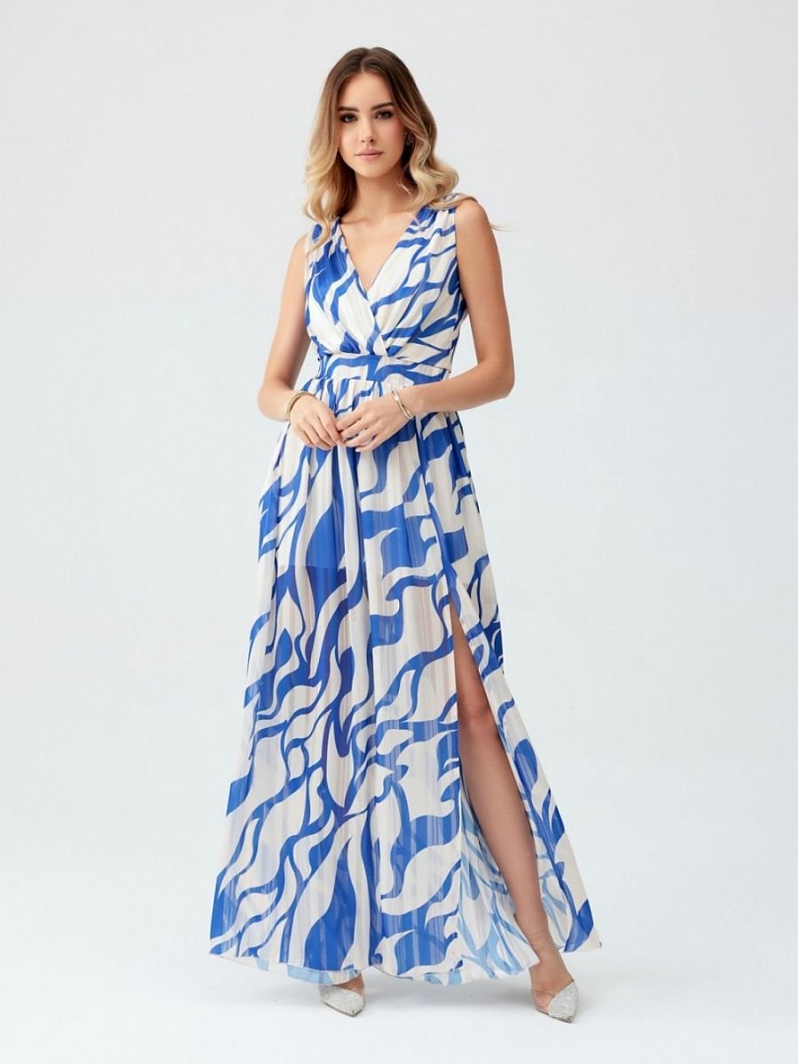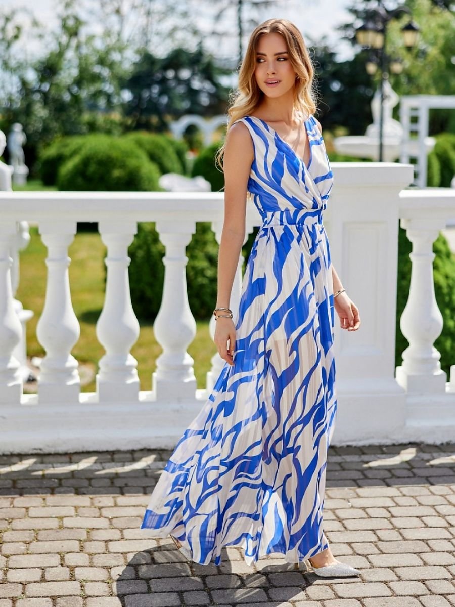 Sukienka została wykonana z przyjemnego, zwiewnego, szyfonowego materiału. Posiada podszewkę, która chroni przed prześwitywaniem materiału. Długość maxi nadaje jej elegancji i wydłuża sylwetkę. Dekolt na zakładkę doskonale wydłuża szyję, a delikatne wycięcie na plecach subtelnie odsłania plecy. Sukienka doskonale dopasowuje się do talii, podkreślając kobiecą sylwetkę, a zwiewna spódnica z szyfonu posiada rozcięcie na nogę, które dodaje całej stylizacji finezji i lekkości. Sukienka zapinana z tyłu na kryty zamek błyskawiczny. Sukienka Lorena to idealna kreacja na wesela, letnie wyjścia lub uroczystości w ogrodzie. Fason sukienki doskonale sprawdzi się na każdej sylwetce. Z łatwością dobierzesz do niej akcesoria, które wzbogacą stylizację i podkreślą wyjątkowość sukienki. Postaw na gładkie buty sandały lub czółenka oraz małą torebkę na łańcuszku i ciesz się elegancką stylizacją, która zachwyci Cię wygodą i pięknym wyglądem. Produkt jest wyprodukowany i uszyty w Polsce.