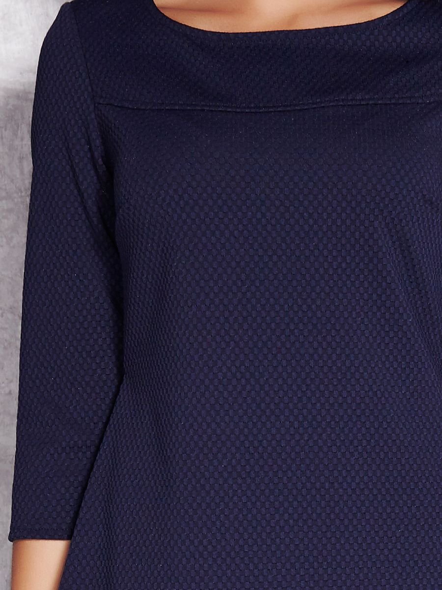 Elegancka sukienka z rękawem 3/4 o rozkloszowanym kroju. Wykonana z materiału w drobny, wytłaczany wzór. Tył przedłużany.