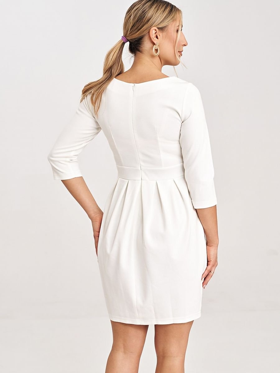 Sukienka z rękawem 3/4, półokrągłym dekoltem, odcinana w pasie. Model wykończony efektownym marszczeniem. Sukienka zapinana na kryty zamek.