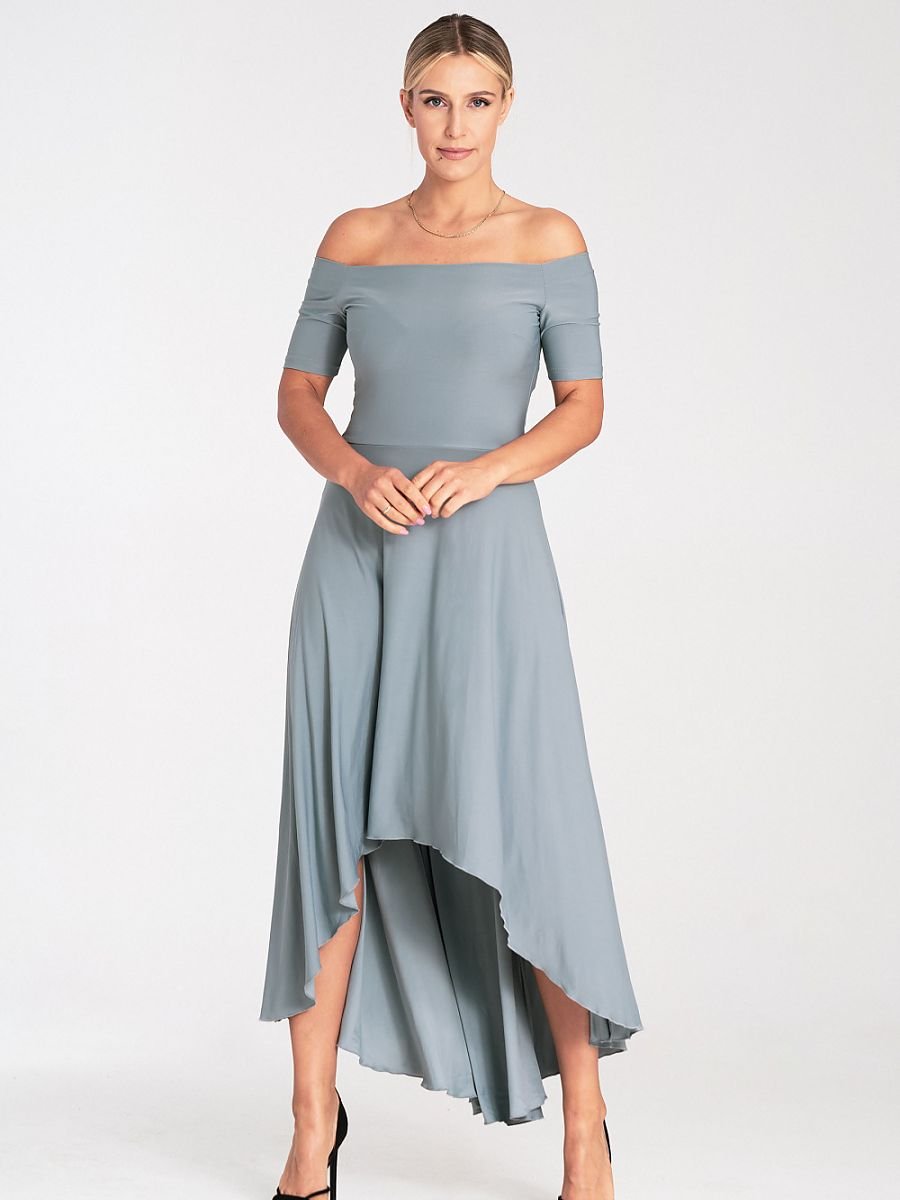 Asymetryczna sukienka bez ramion. Sukienka taliowana w pasie, zapinana z tyłu na zamek. Z tyłu długość maxi, z przodu za kolano. Dół sukienki luźny, rozkloszowany.
