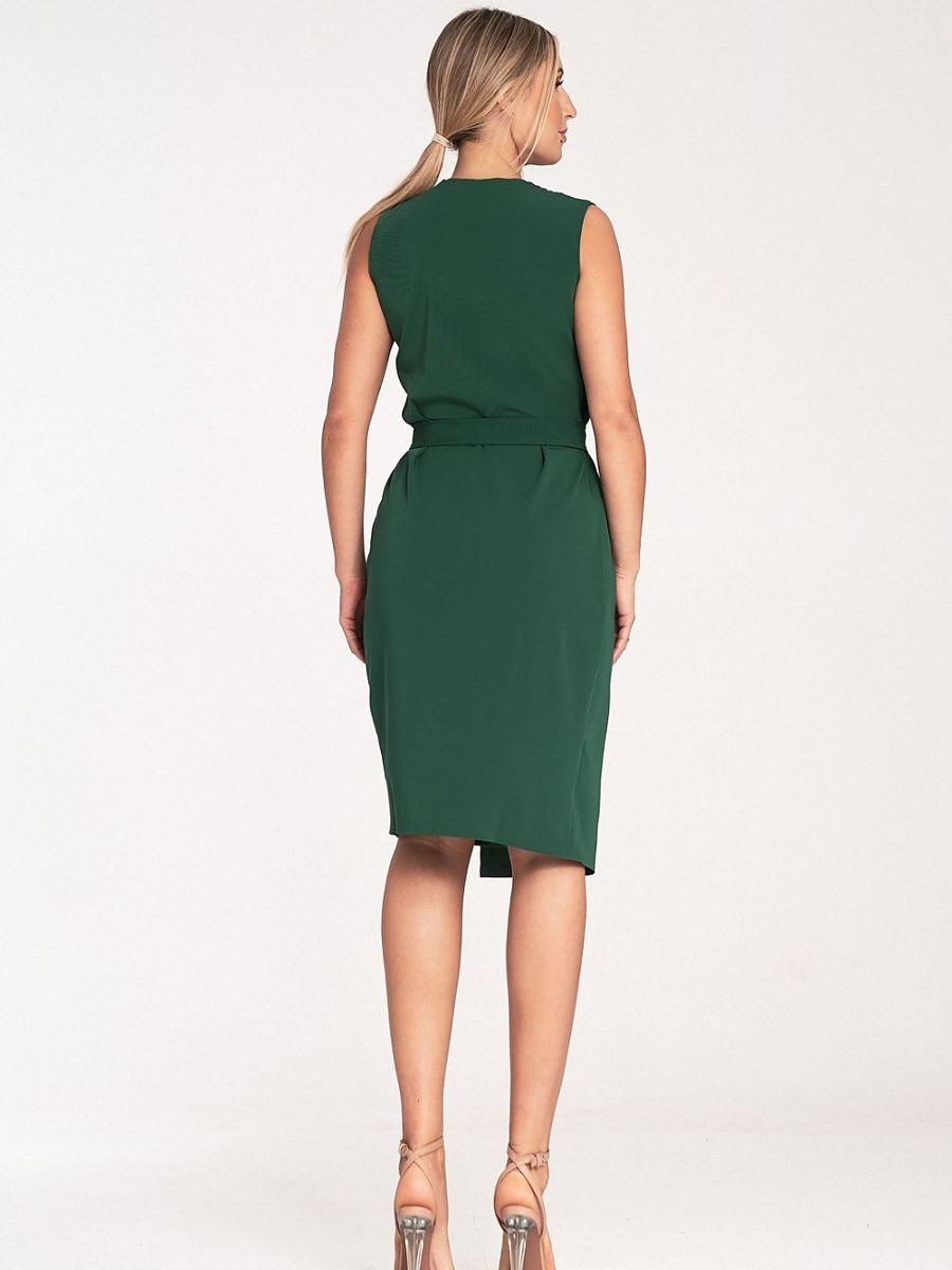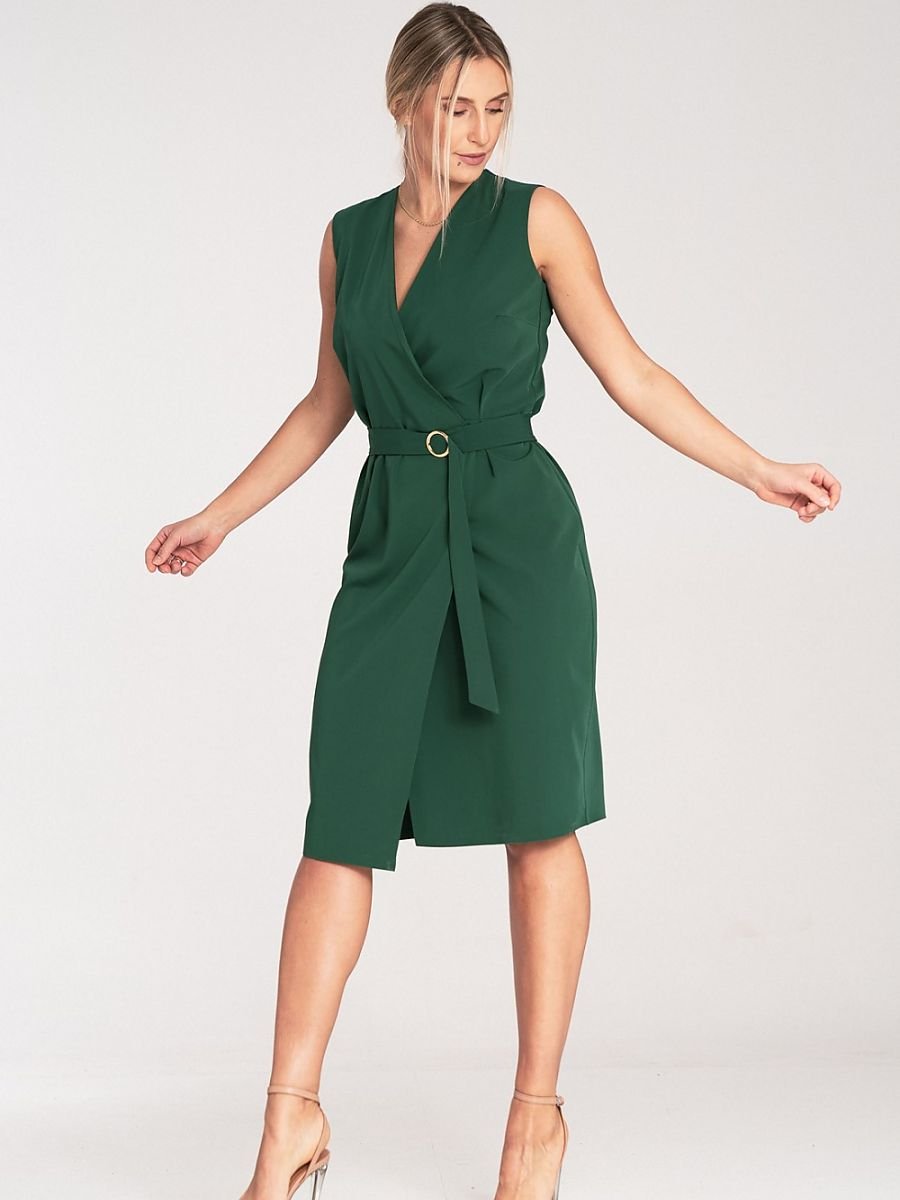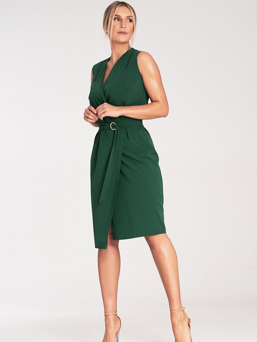Sukienka midi bez rękawów. Dół sukienki ołówkowy bez kieszeni Sukienka z paskiem i ozdobną złotą metalową klamrą. Kopertowy dekolt.