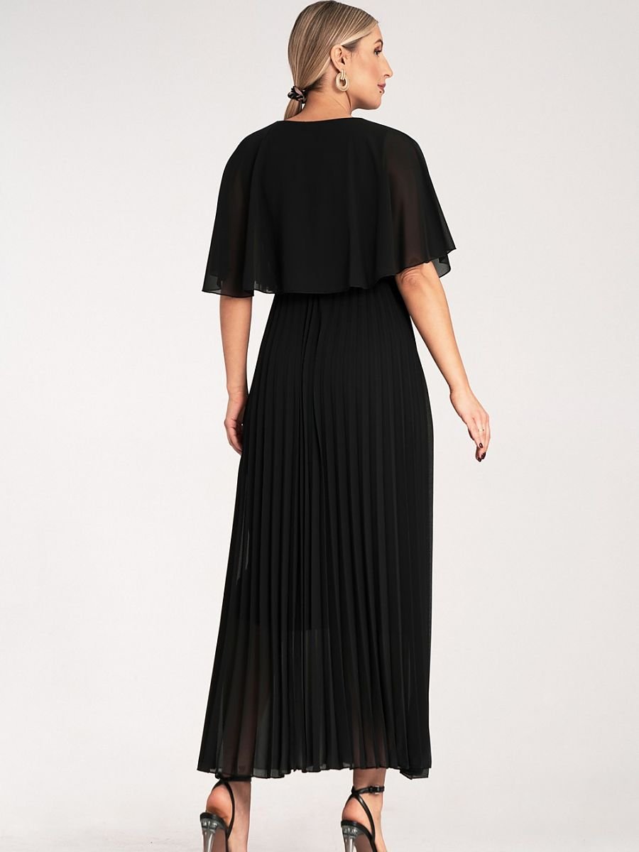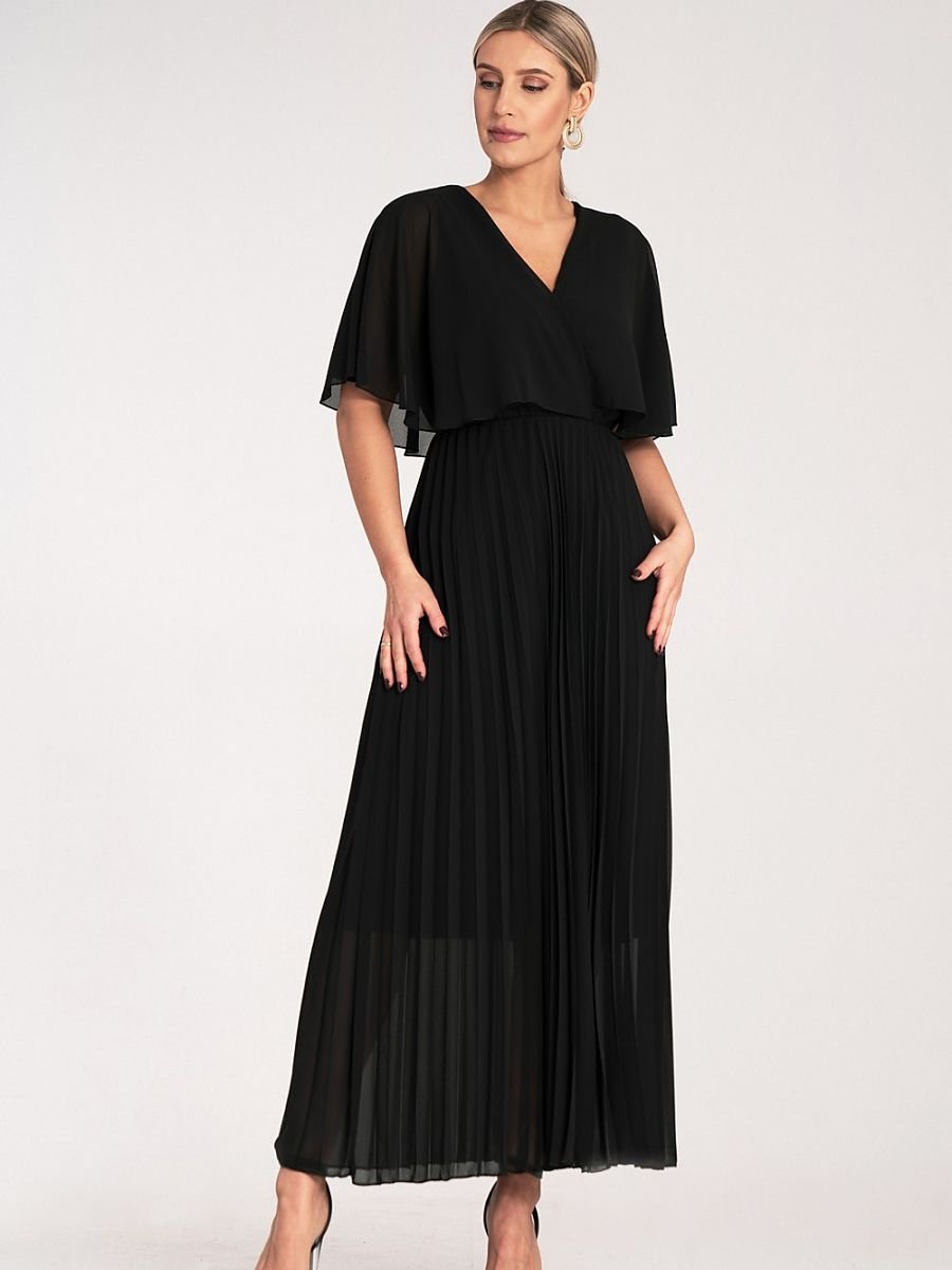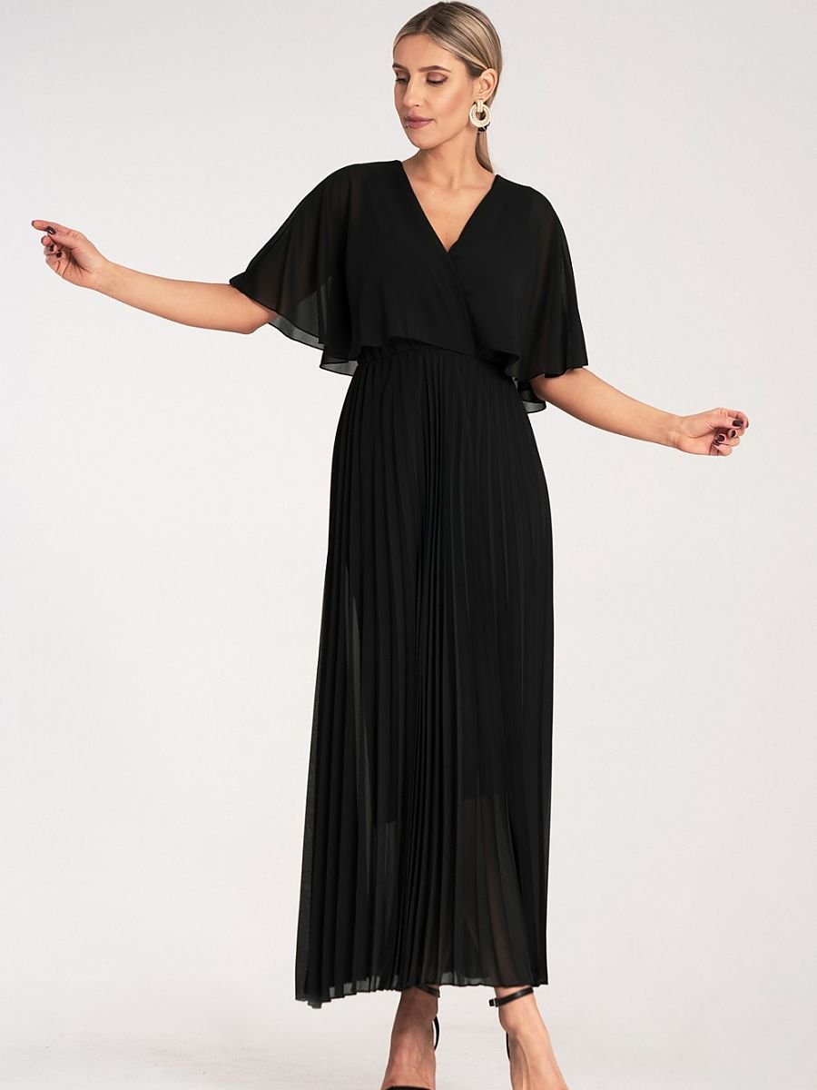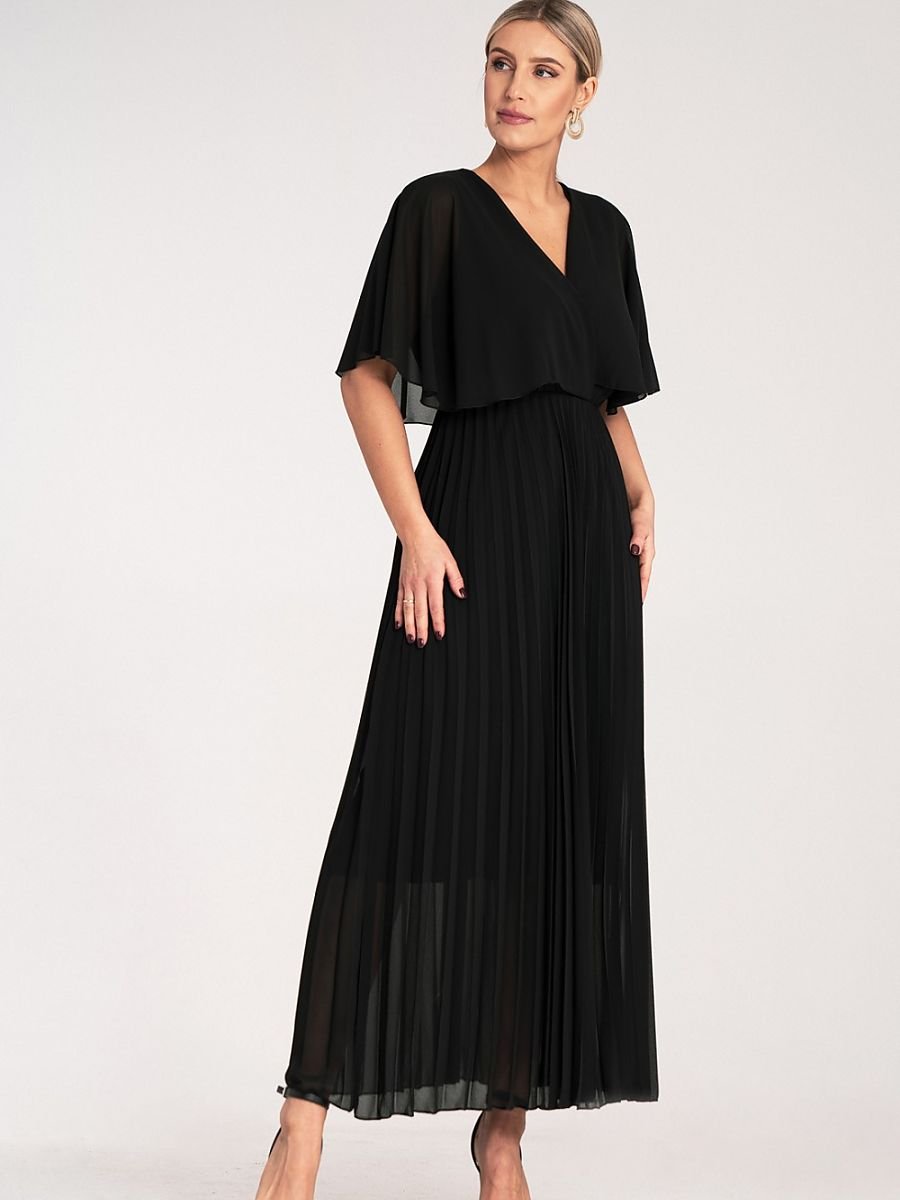 Sukienka maxi z luźnymi, półprzezroczystymi rękawami przypominająca pelerynę z plisowanyn dołem. Dekolt w kształcie litery V, elastyczna talia podkreślająca sylwetkę. Podszewka z wiskozy.