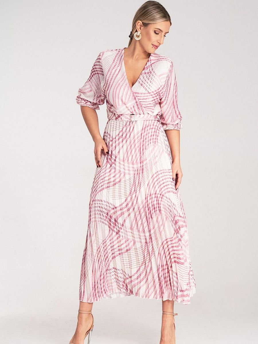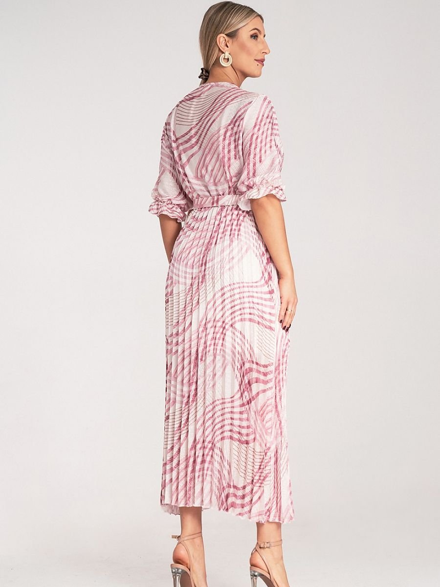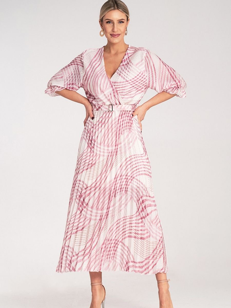 Satynowa sukienka maxi z wzorem w panterkę. Kopertowy dekolt, długie rękawy zakończone gumką. Model z plisowanym dołem i elastycznym paskiem w talii.