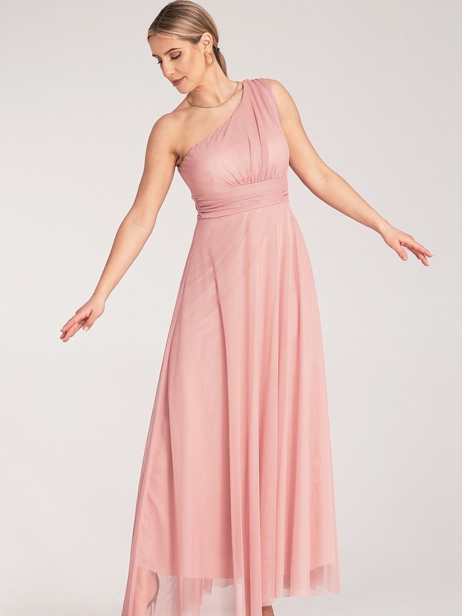 Elegancka sukienka maxi wykonana z lekkiego, zwiewnego materiału. Asymetryczny fason z jednym szerokim ramiączkiem oraz marszczeniami w talii.