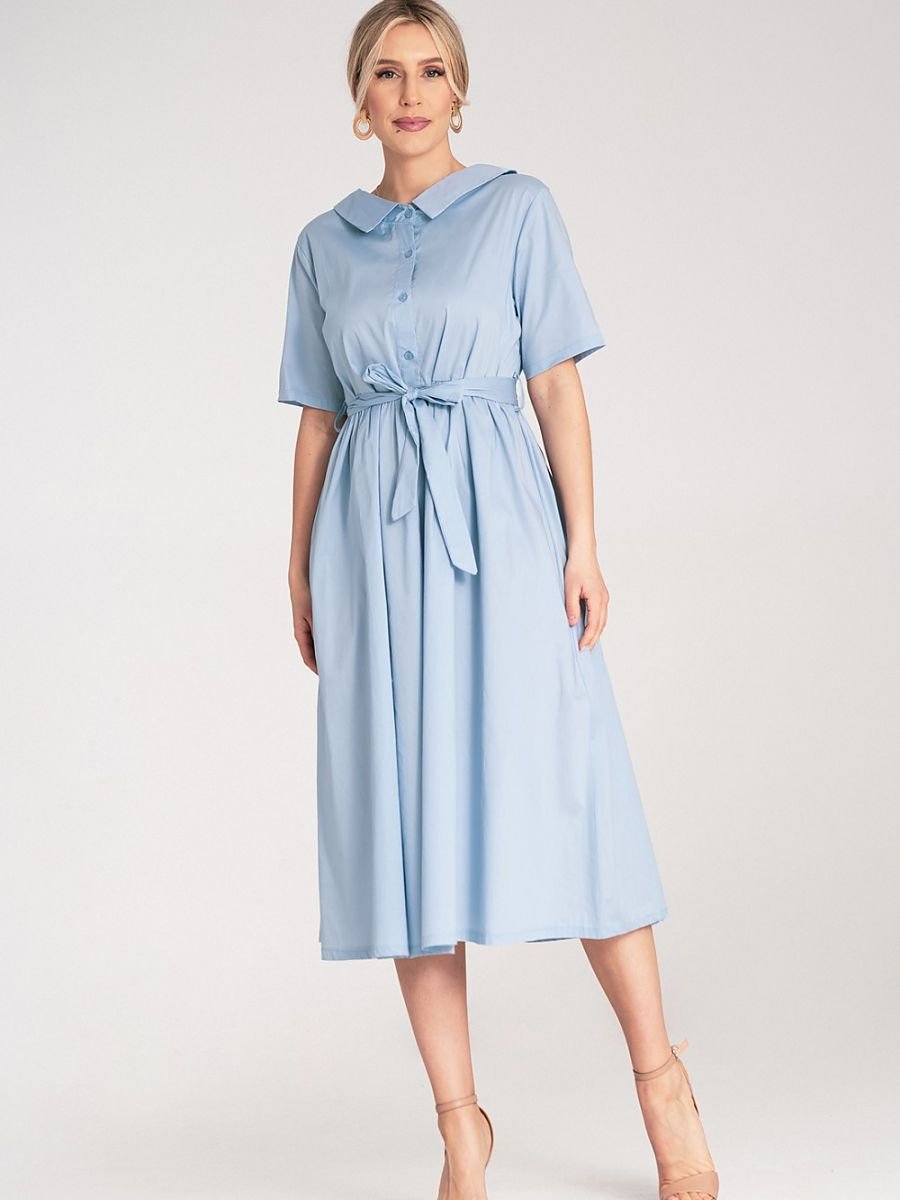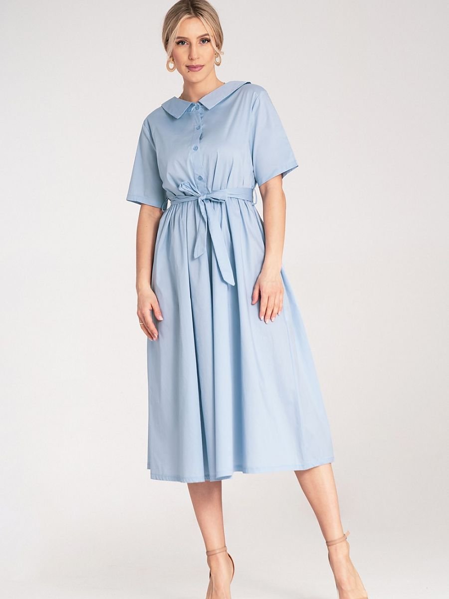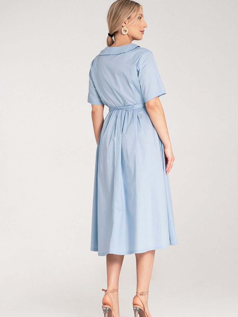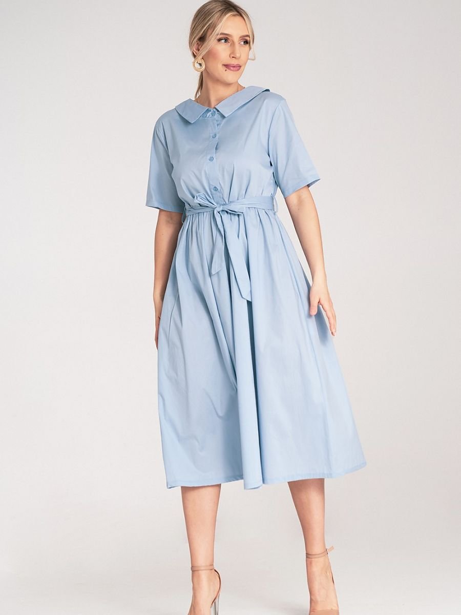 Sukienka o długości midi, wykonana z koszulówki. Góra z krótkim rękawem, zapięciem na guziki i półokrągłym kołnierzykiem o miękkiej linii. Sukienka z paskiem do wiązania z tego samego materiału. Dół rozkloszowany, z drobnymi zakładkami z tyłu, tworzy klasyczny fason w literę A.