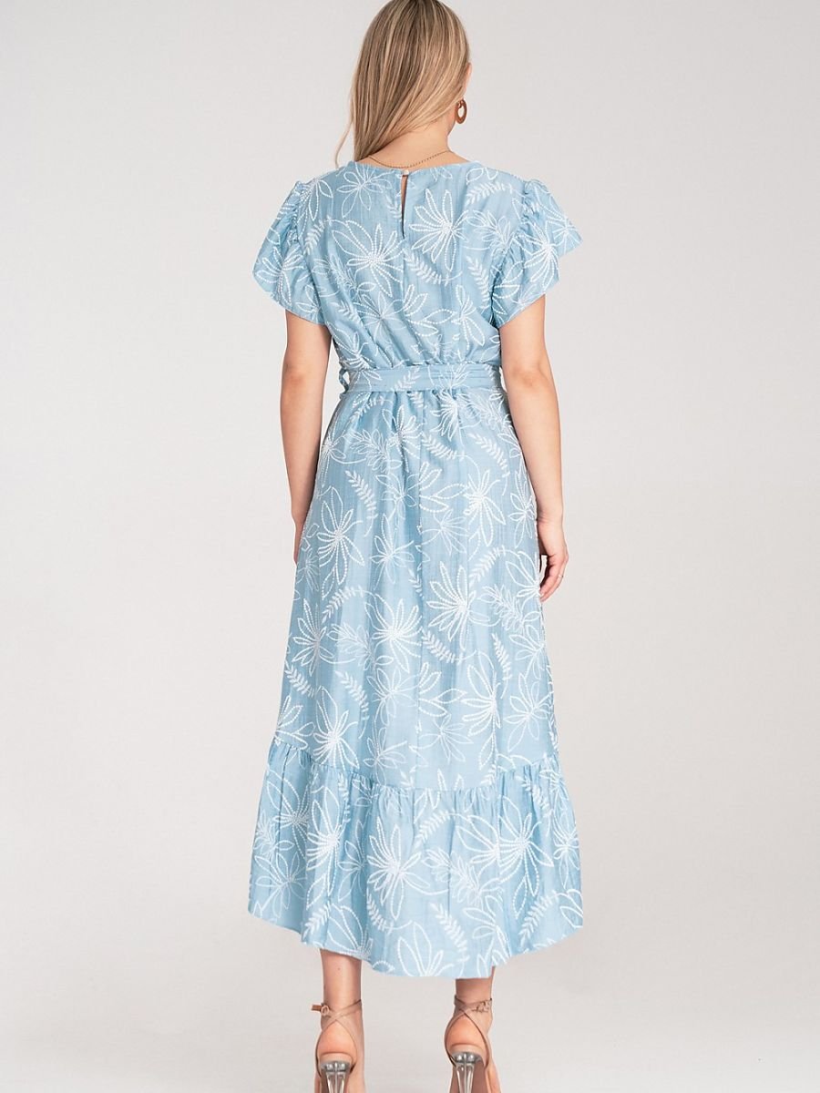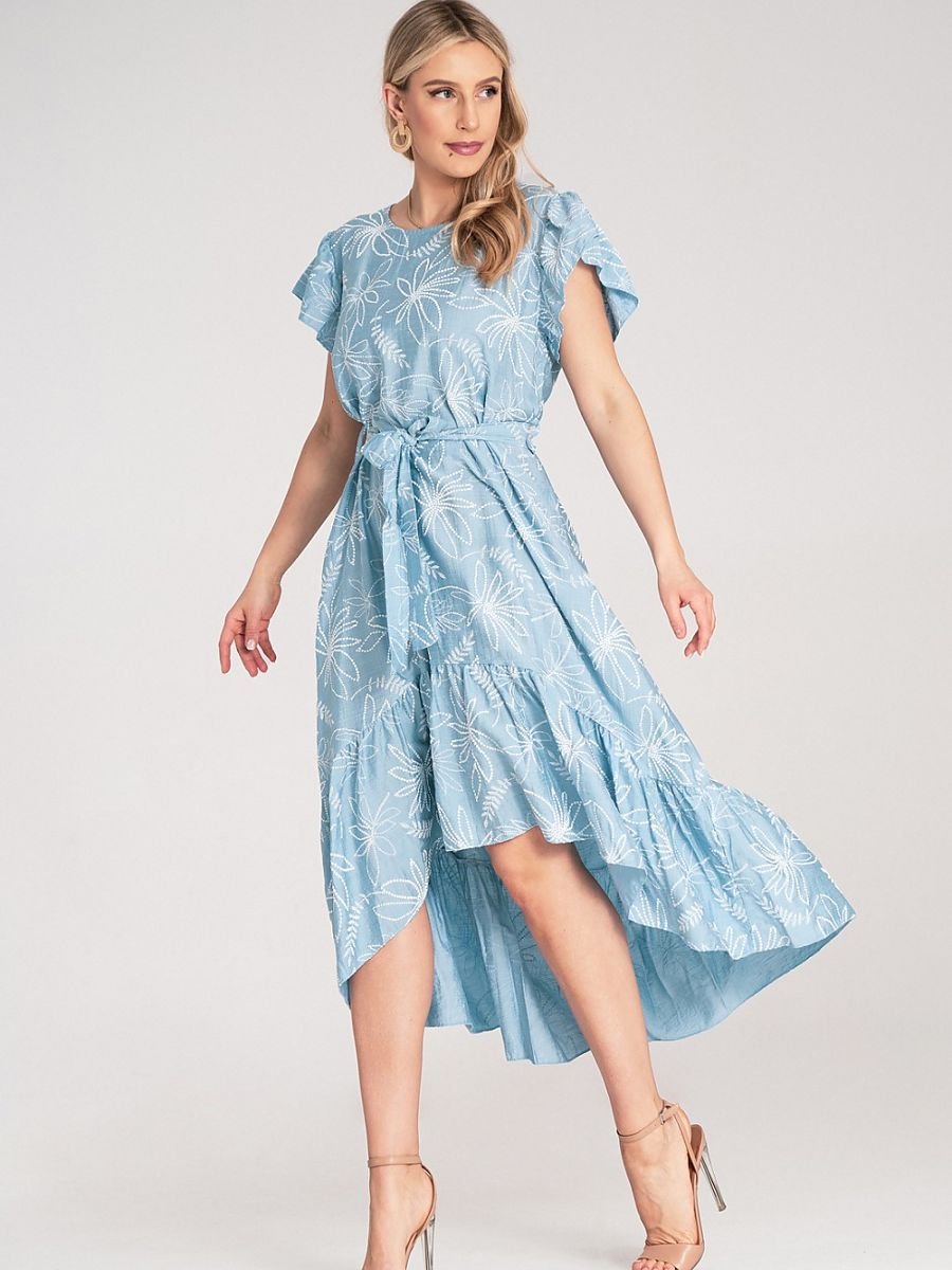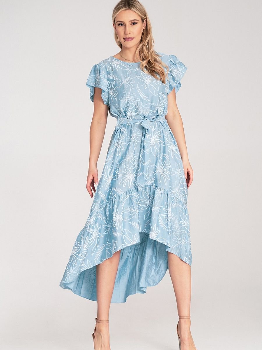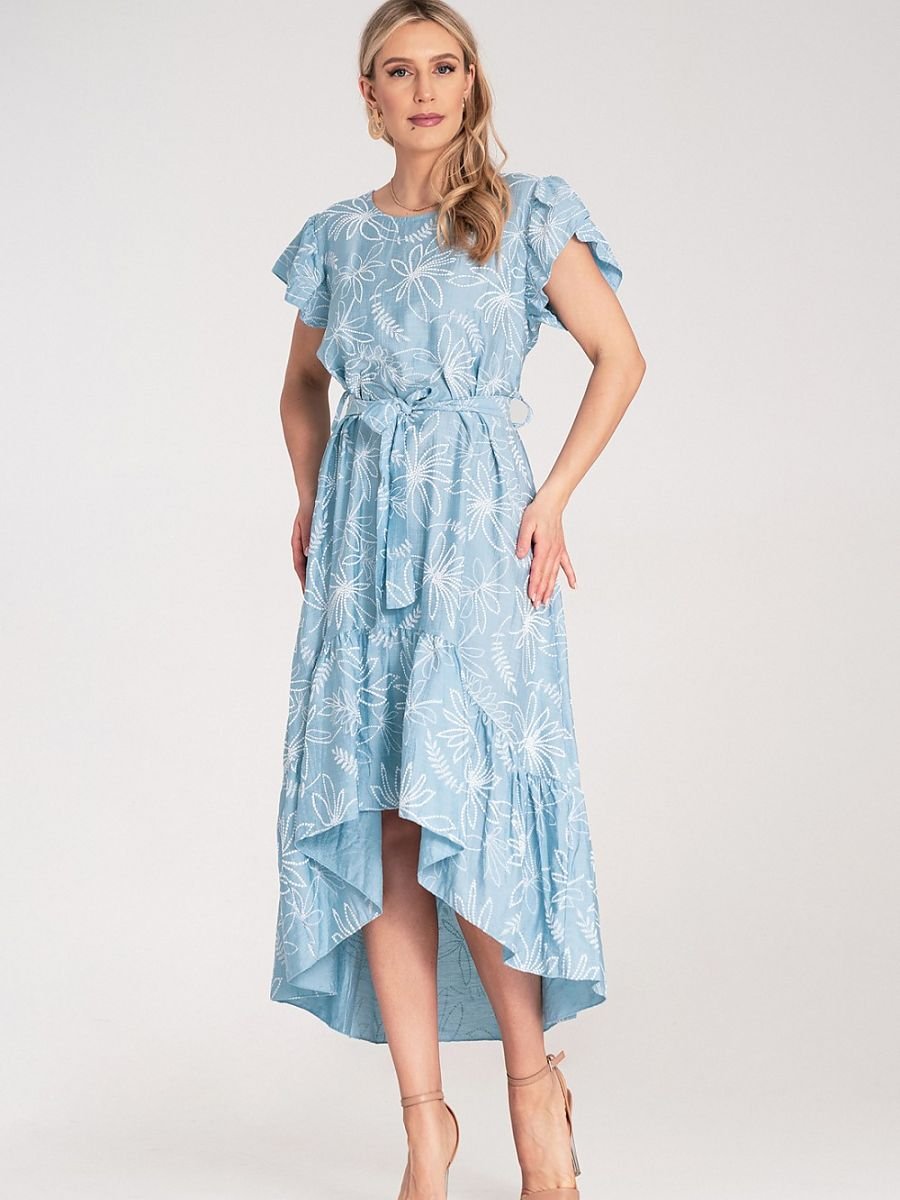 Sukienka midi wykonana z lekkiego materiału. Na całej powierzchni nadrukowany motyw kwiatowy z wypukłą, gumową fakturą. Góra z okrągłym dekoltem, falbanowymi rękawami i zapięciem na guzik z tyłu. W talii wiązany pasek z tego samego materiału. Dół sukienki asymetryczny z falbaną. Przód krótszy niż tył.