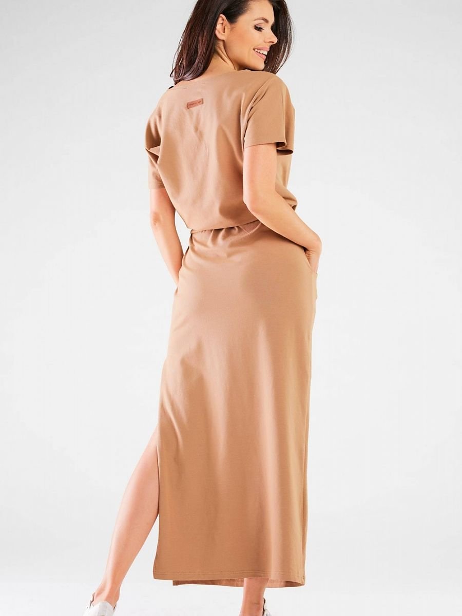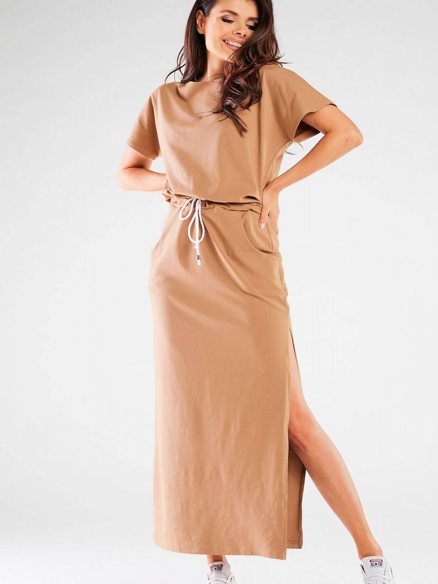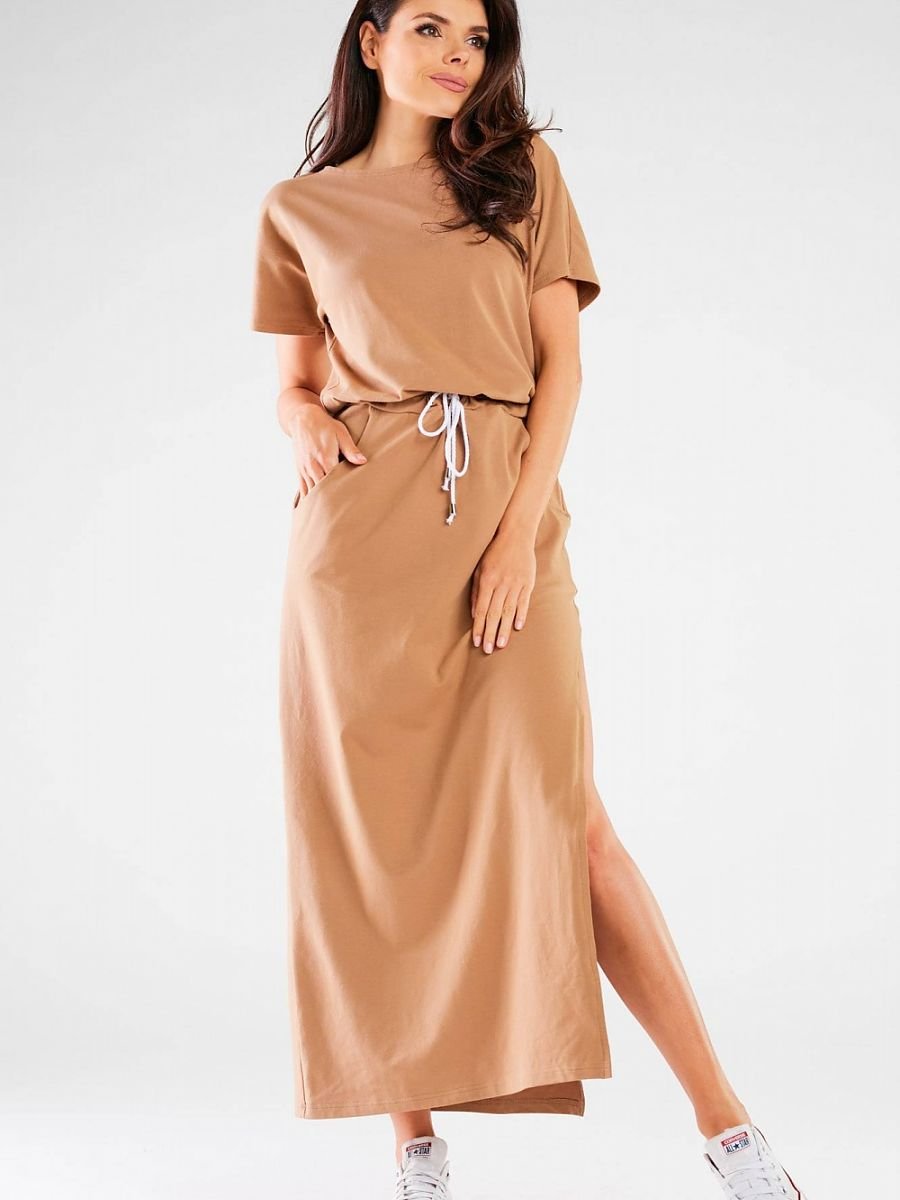 Długa letnia sukienka. Materiał przyjemny w dotyku pozwala skórze na swobodne oddychanie, dzięki czemu sukienka jest niesamowicie komfortowa oraz wygodna w noszeniu. Model z krótkim rękawem to najlepsza opcja w sezonie wiosenno-letnim. Zaprojektowano i uszyto w Polsce.