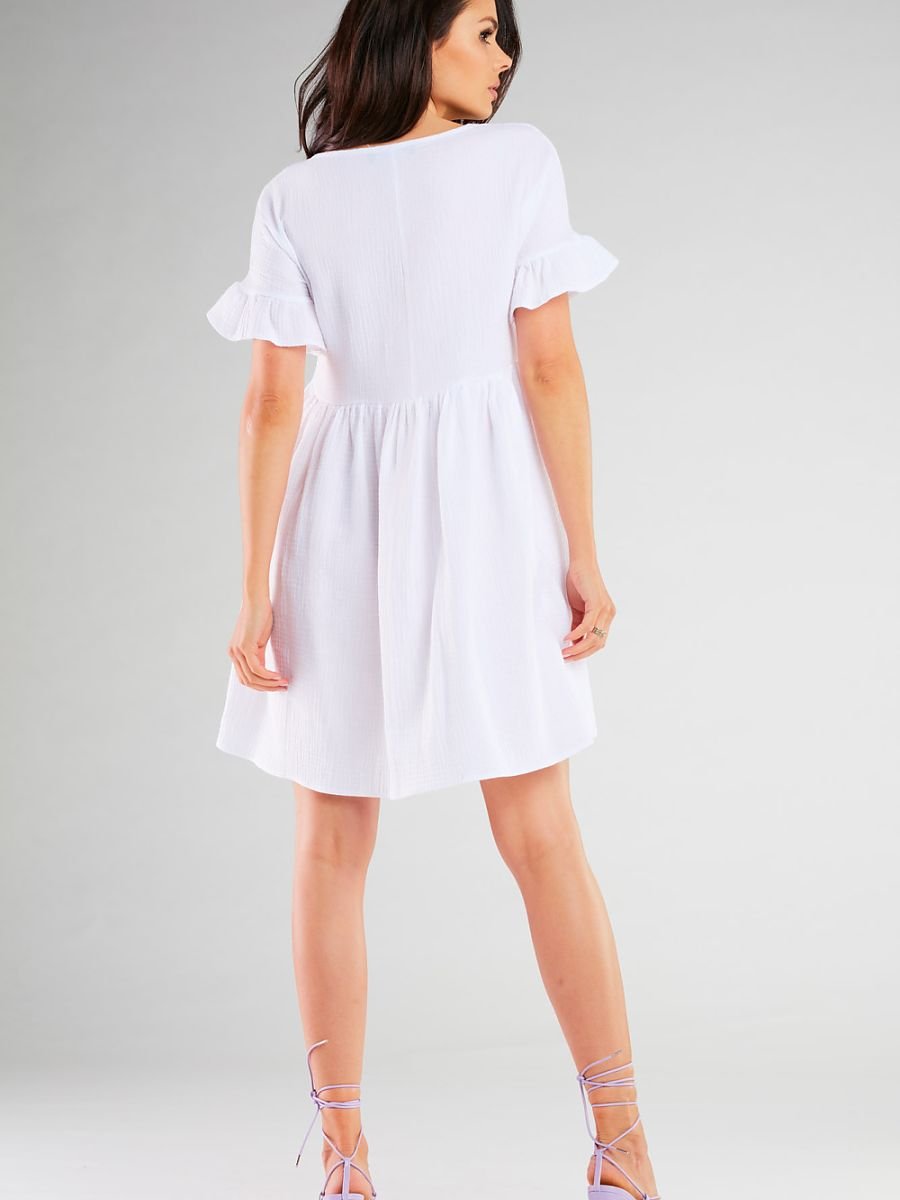 Sukienka została wykonana głownie z bawełny oraz niewielkiej domieszki elastanu. Materiał niezwykle sprężysty pozwala skórze na swobodne oddychanie. Model z krótkim rękawem to idealna opcja w sezonie wiosenno-letnim. Sukienka rozkloszowana, rewelacyjnie tuszuję drobne niedoskonałości sylwetki. Zaprojektowano i uszyto w Polsce.