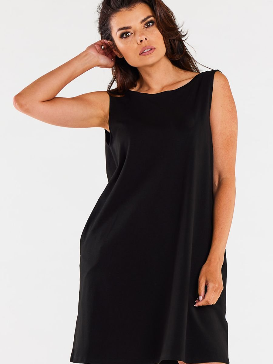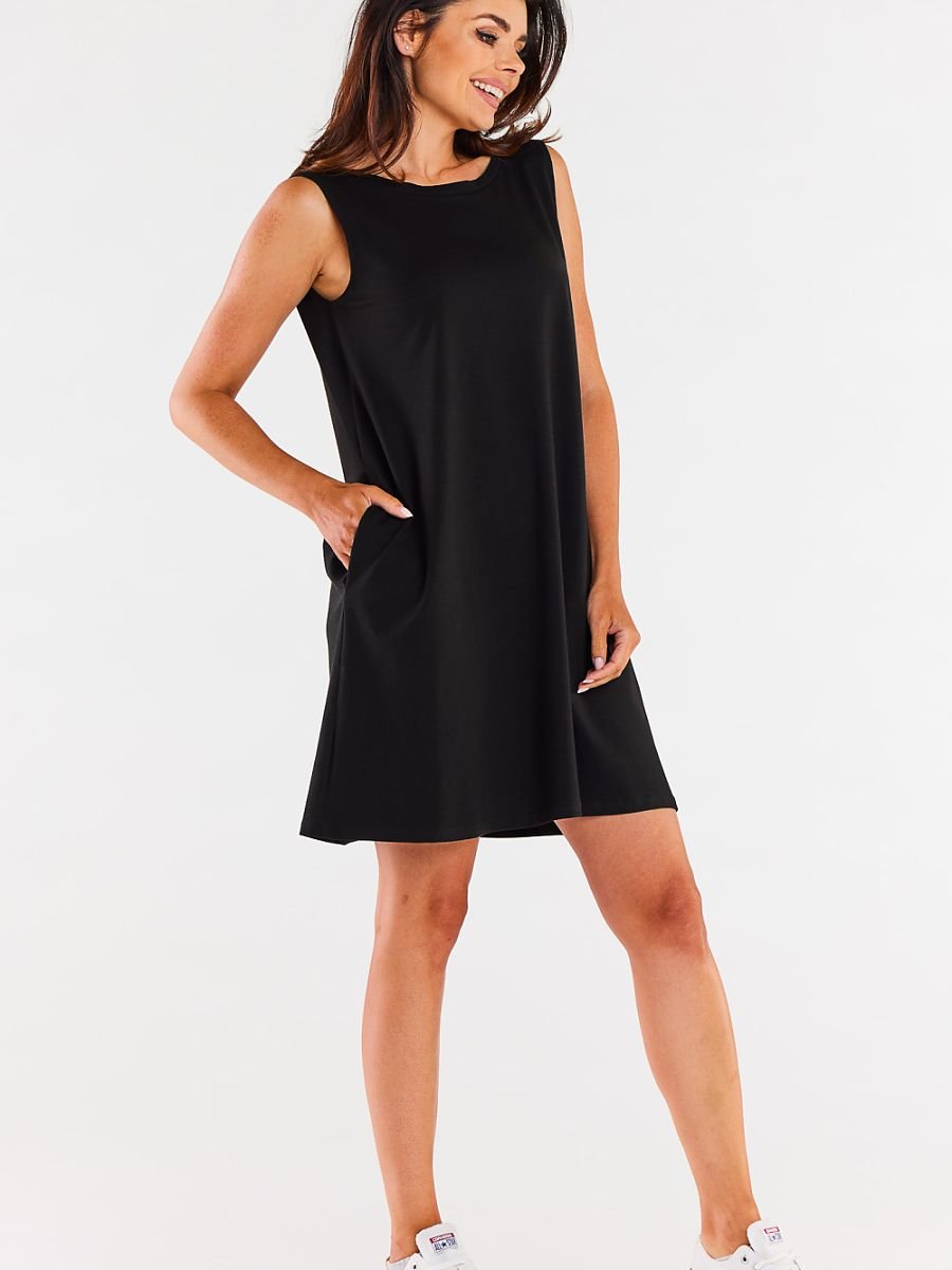 Sukienka o luźniejszym kroju, bez rękawów, zapewniająca swobodę ruchów i komfort noszenia. Z przodu klasyczny, okrągły dekolt, natomiast z tyłu efektowny dekolt w kształcie litery V, dodający kobiecego charakteru. Praktyczne kieszenie ukryte w szwach bocznych to funkcjonalny detal. Idealna na co dzień, do pracy lub na letnie spotkania.
