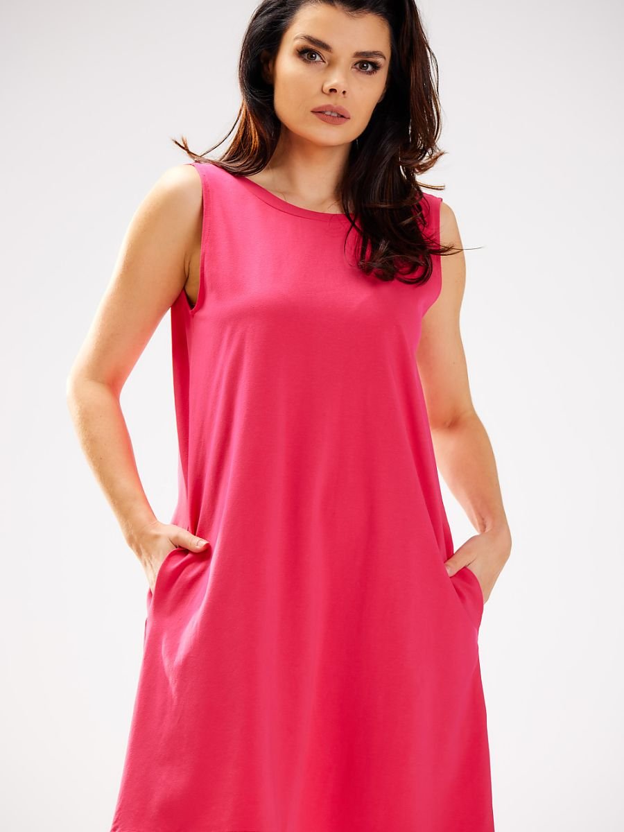 Sukienka o luźniejszym kroju, bez rękawów, zapewniająca swobodę ruchów i komfort noszenia. Z przodu klasyczny, okrągły dekolt, natomiast z tyłu efektowny dekolt w kształcie litery V, dodający kobiecego charakteru. Praktyczne kieszenie ukryte w szwach bocznych to funkcjonalny detal. Idealna na co dzień, do pracy lub na letnie spotkania.