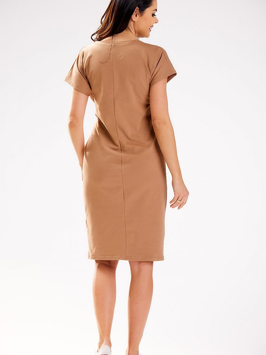 Sukienka midi z krótkim rękawem. Posiada asymetryczne wiązanie na przodzie. Całość wykonana z przyjemnej dla ciała bawełny. Zaprojektowano i uszyto w Polsce.