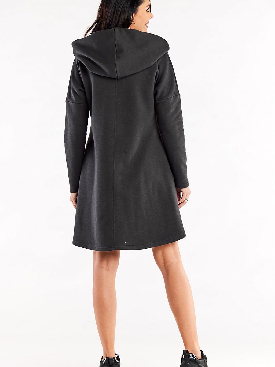Luźna, trapezowa sukienka z długim rękawem, oraz kapturem, w szwach bocznych kieszenie wsuwane. Propozycja idealna na co dzień.