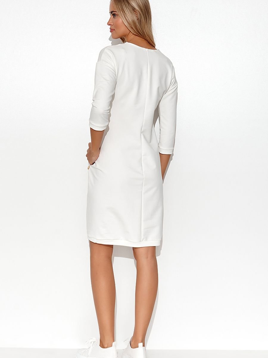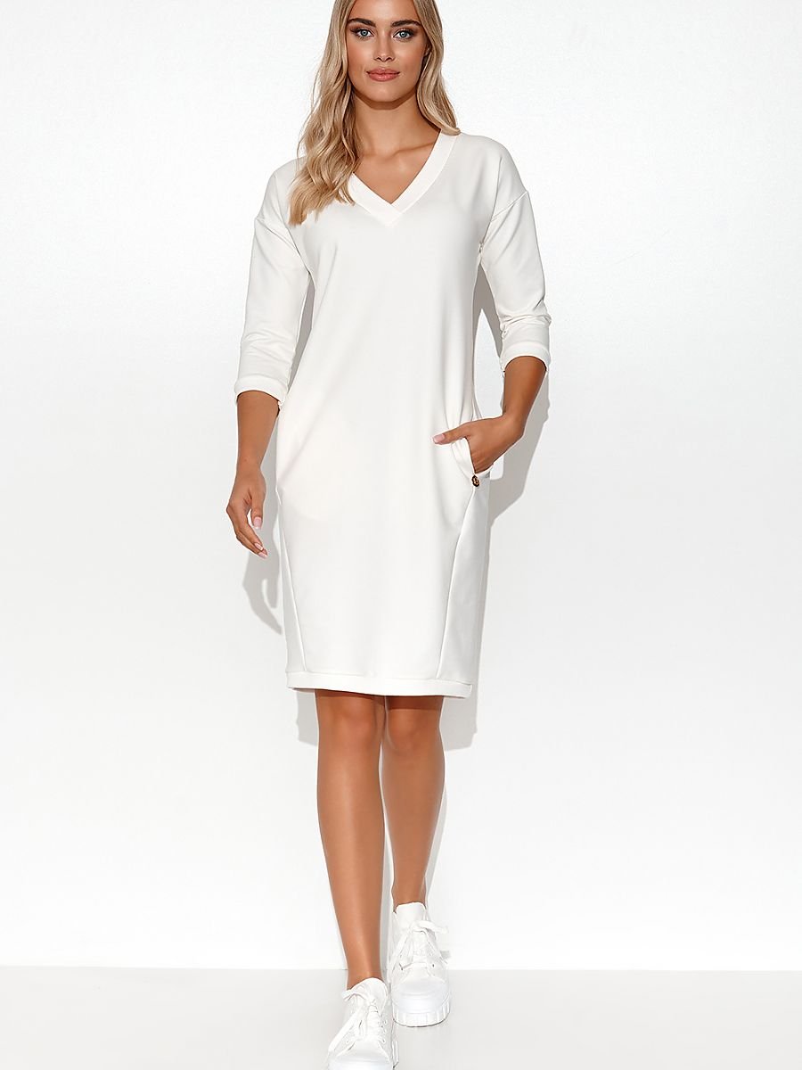 Dresowa sukienka o prostym, casualowym kroju. Posiada głęboki dekolt w serek, rękawy 3/4 oraz praktyczne kieszenie boczne. Przy jednej z nich wszyta została ozdobna złota blaszka. Sukienka posiada ściągacze, które nadają sportowego wydźwięku. Tył sukienki jest gładki, z ukrytym szwem umiejscowionym centralnie. To doskonała letnia propozycja, do której założysz lekkie trampki czy sportowe sandały i spędzisz dzień aktywnie.