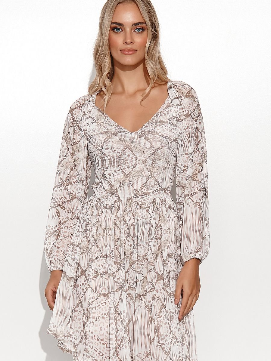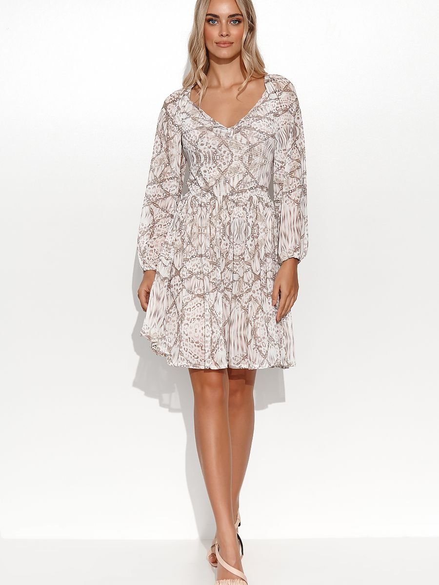 Zwiewna sukienka o niezwykle dziewczęcym fasonie. Posiada długi, lekko bufiasty rękaw. Z przodu widoczny jest dość mocno wycięty dekolt, z materiałem zebranym na biuście. Centralnie wszyty został kawałek materiału, który imituje kokardę. Z tyłu sukienki obecne jest wiązanie wraz ze ściągaczem. Chociaż plecy są widoczne, w sukience zawarty jest dodatkowy pasek materiału, który zakrywa bieliznę. Dzięki temu możesz założyć do tej kreacji biustonosz. Oznacza to, że ten dziewczęcy fason sukienki jest zarezerwowany również dla pań z większym biustem. Gumka ściągająca jest obecna również na linii talii. Spodnia część sukienki jest uszyta z jednolitego materiału. Z kolei wierzchnia to wzorzysta siatka dostępna w trzech wariantach, które różnią się między sobą kolorem i motywem.