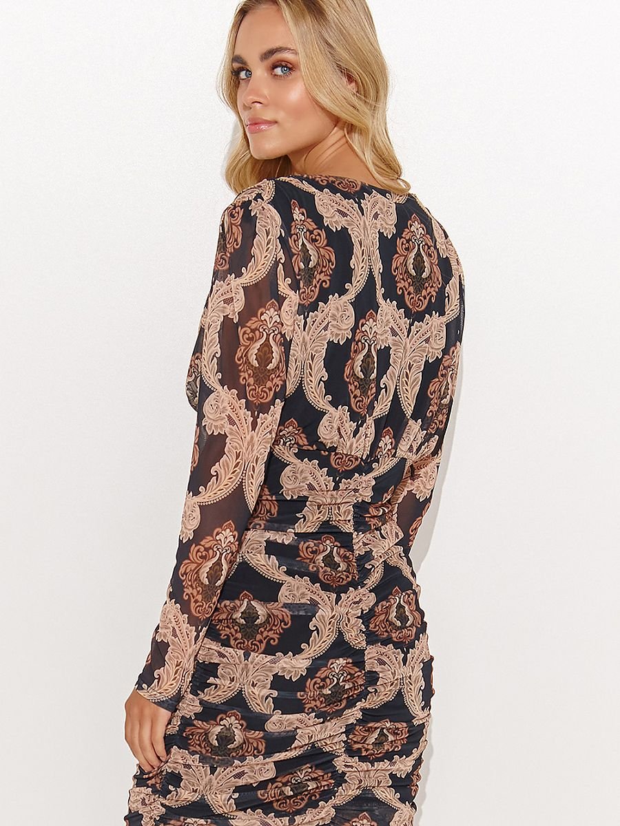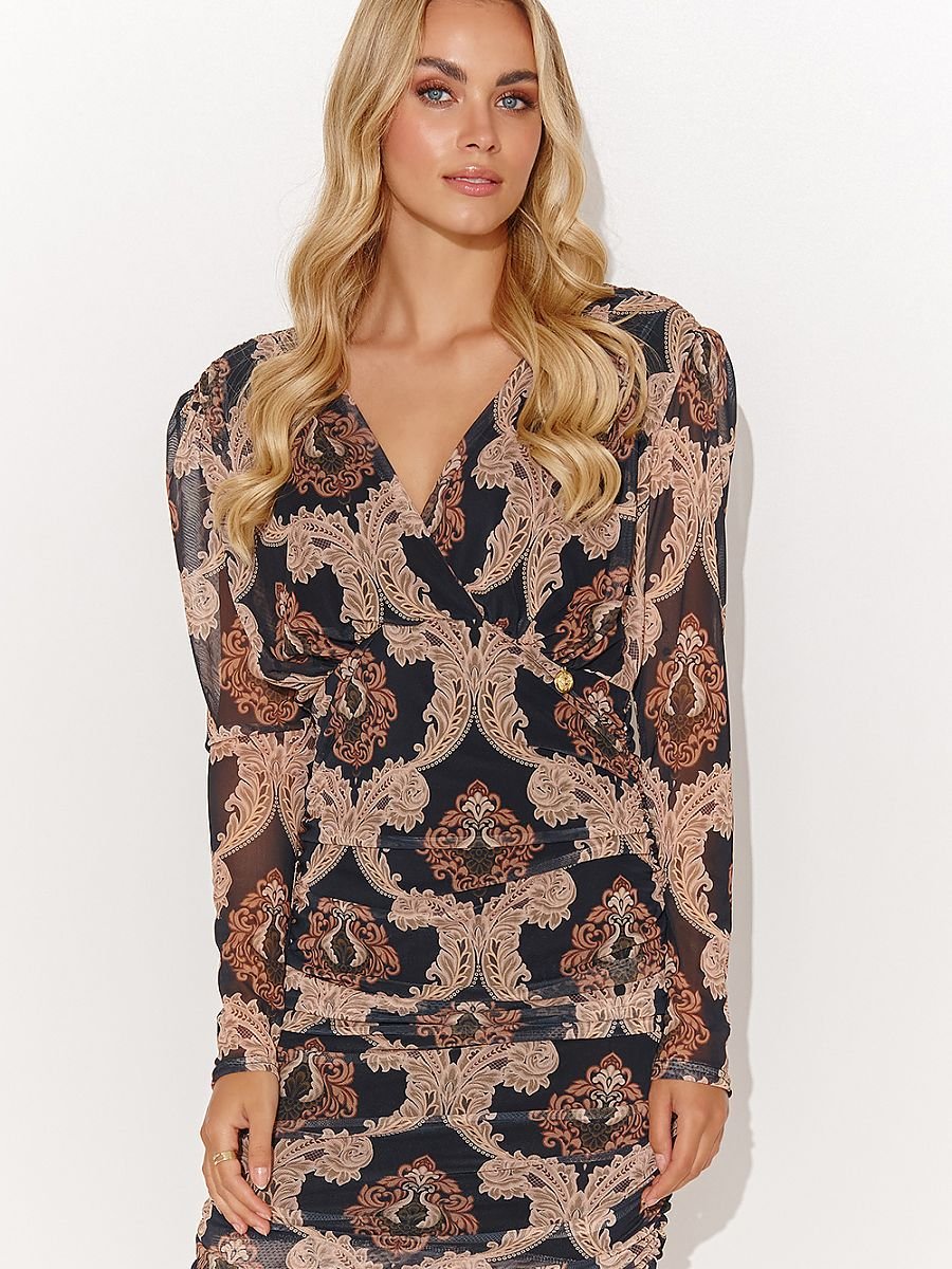Sukienka mini uszyta z tkaniny siatkowej, z podszewką. Posiada lekko bufiaste długie rękawy. Dostępna w 4-ech wzorach o ciekawych motywach i różnorodnej kolorystyce. Sukienka jest dopasowana do ciała i lekko marszczona. Z przodu posiada ozdobną blaszkę. Ma dekolt w serek i odcięcie pod biustem. To doskonały wybór na spotkania z przyjaciółkami, randkę lub imprezę. Dzięki dopasowanemu krojowi i lekkim marszczeniom, sukienka podkreśli Twoją sylwetkę. Wybierając odpowiednie dodatki, takie jak delikatna biżuteria i modne buty, stworzysz efektowny i stylowy look na różnorodne okazje.