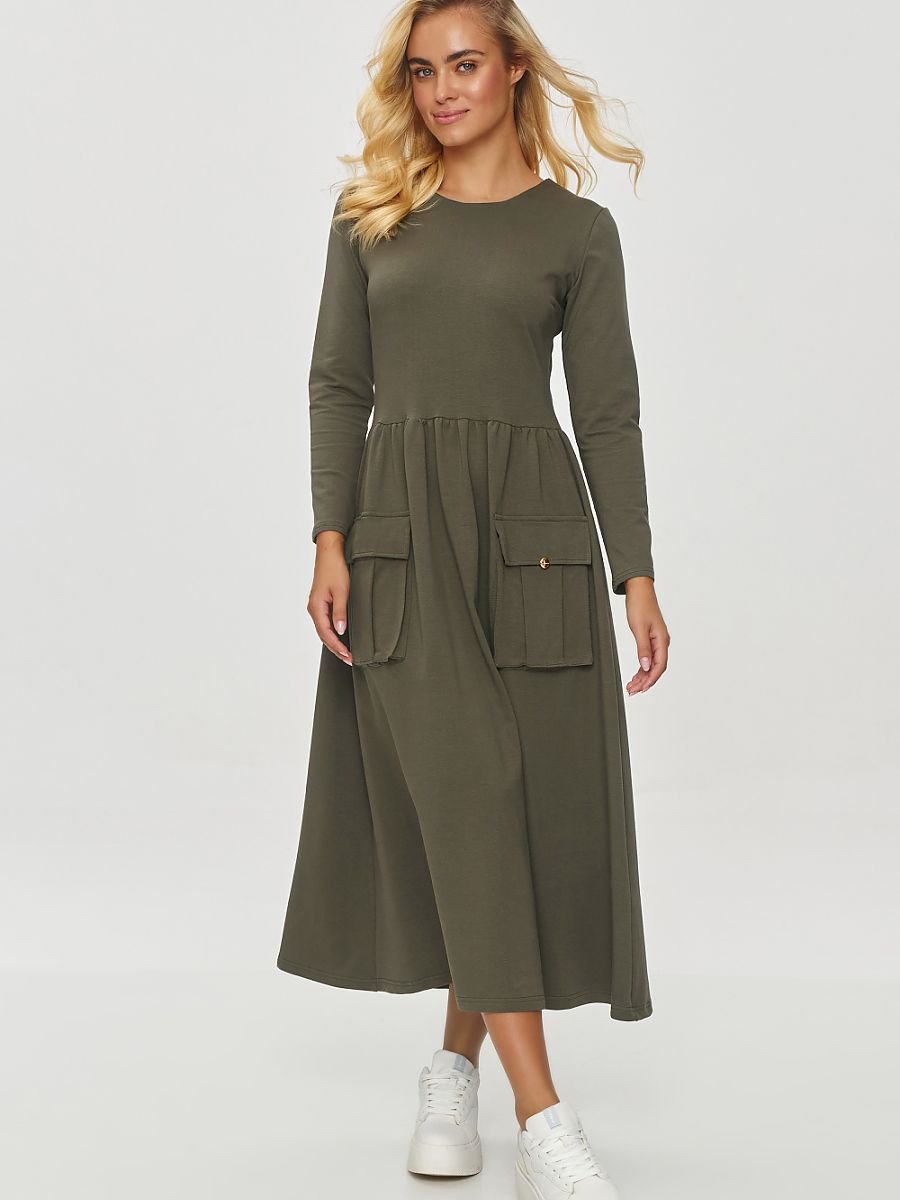 Rozkloszowana sukienka to doskonały wybór dla osób, które cenią sobie połączenie stylu i funkcjonalności. Model ma klasyczny, kobiecy krój o długości midi, z rozkloszowanym dołem. Wykonana z miękkiego, wygodnego materiału, który świetnie sprawdzi się w codziennym użytkowaniu. Sukienka posiada długie rękawy, co czyni ją idealną na chłodniejsze dni. Odcięcie w talii daje efekt subtelnego marszczenia, które podkreśla sylwetkę i dodaje sukience uroku. Charakterystycznym elementem są duże, naszywane kieszenie z przodu, dodatkowo zdobione eleganckim pozłacanym detalem, które nie tylko dodają stylu, ale również pełnią funkcję praktyczną. Ten model łączy w sobie wygodę i modny design, będąc idealnym wyborem na różne okazje.