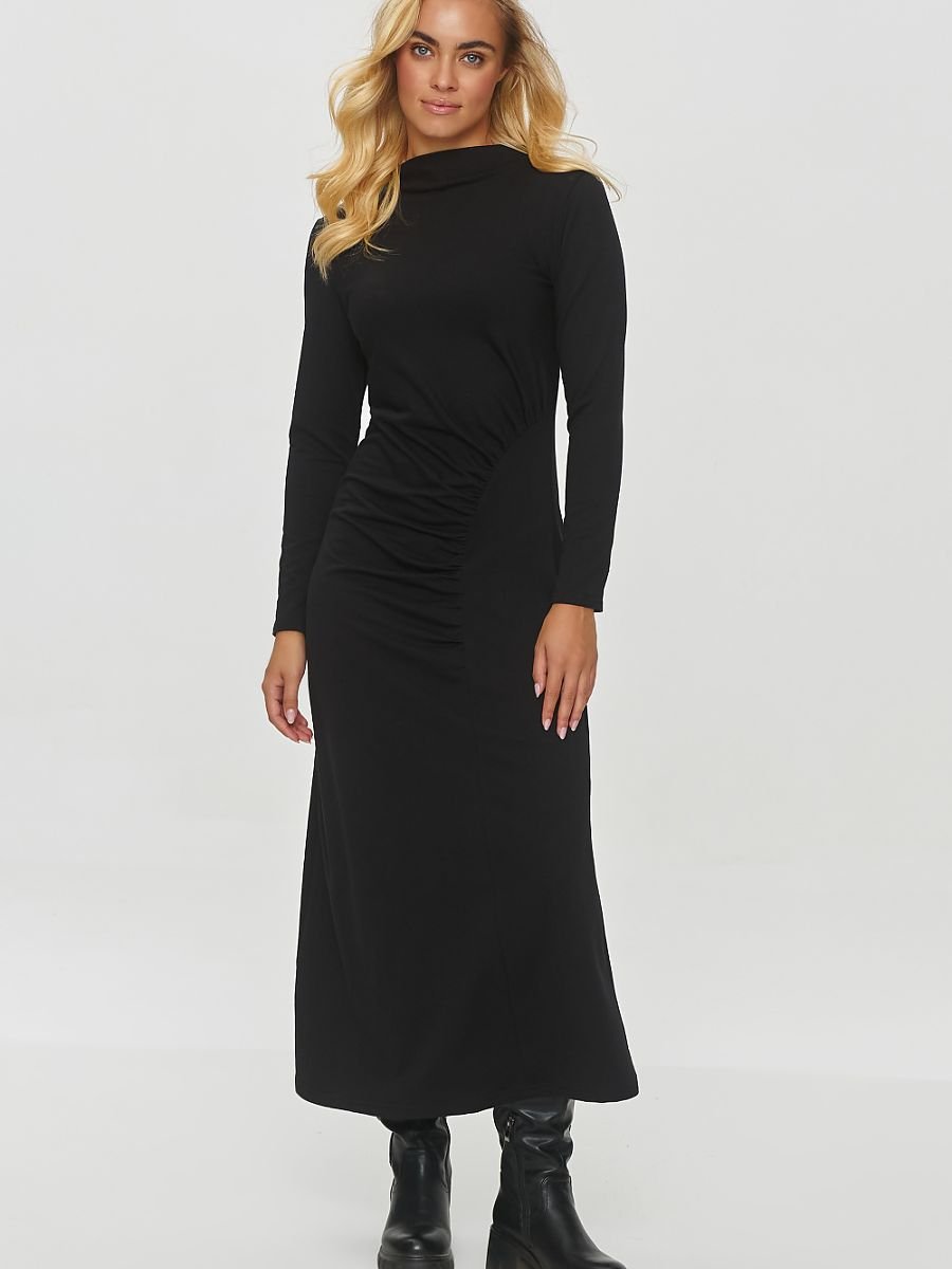 Drapowana sukienka tworzy elegancką i minimalistyczną propozycję, która łączy w sobie prostotę z subtelnymi detalami. Model ma długość midi, sięgającą do połowy łydki, co nadaje jej szykowności i klasycznego wyglądu. Krój jest prosty, ale z efektownym akcentem w postaci marszczenia po lewej stronie talii, które dodaje sukience kształtu i podkreśla sylwetkę. Model posiada długie rękawy, które zapewniają komfort i sprawiają, że model jest odpowiedni na chłodniejsze dni. Wysoka stójka dodaje sukience elegancji, a jednocześnie utrzymuje ją w casualowym stylu. Drapowanie w okolicy talii to delikatny detal, który nadaje jej dynamiki i lekkości, subtelnie eksponując kobiece kształty. Dzięki neutralnym kolorom sukienka może być łatwo zestawiona z różnymi dodatkami, zarówno w stylu eleganckim, jak i bardziej casualowym. Model jest idealny dla kobiet, które cenią sobie komfort, prostotę, ale jednocześnie nie rezygnują z kobiecego stylu. Możesz ją zestawić ze sportowym obuwiem zyskując outfit o nowoczesnym i sportowym charakterze. Taka stylizacja sprawdzi się na co dzień, na spotkania ze znajomymi czy na spacer.