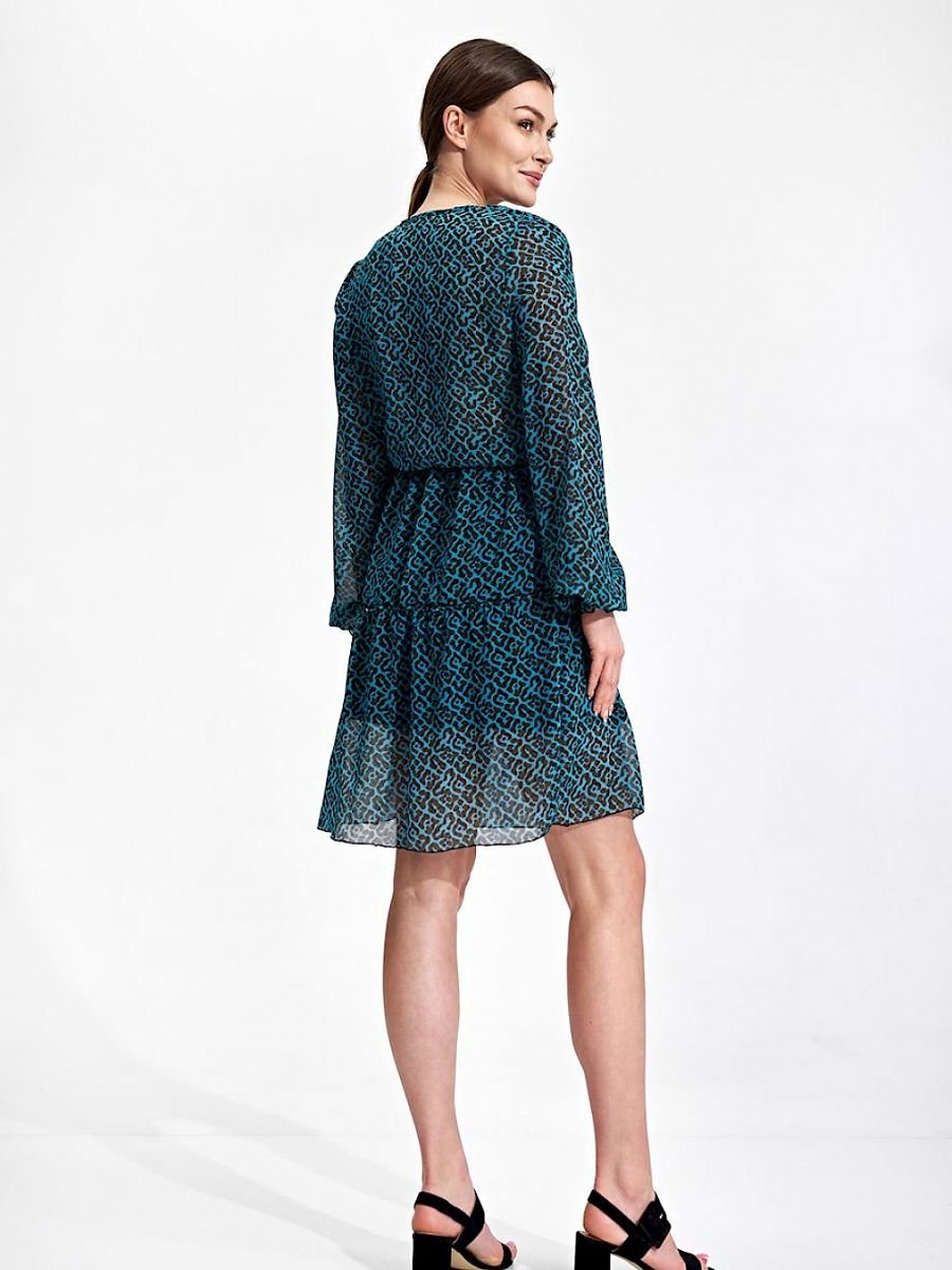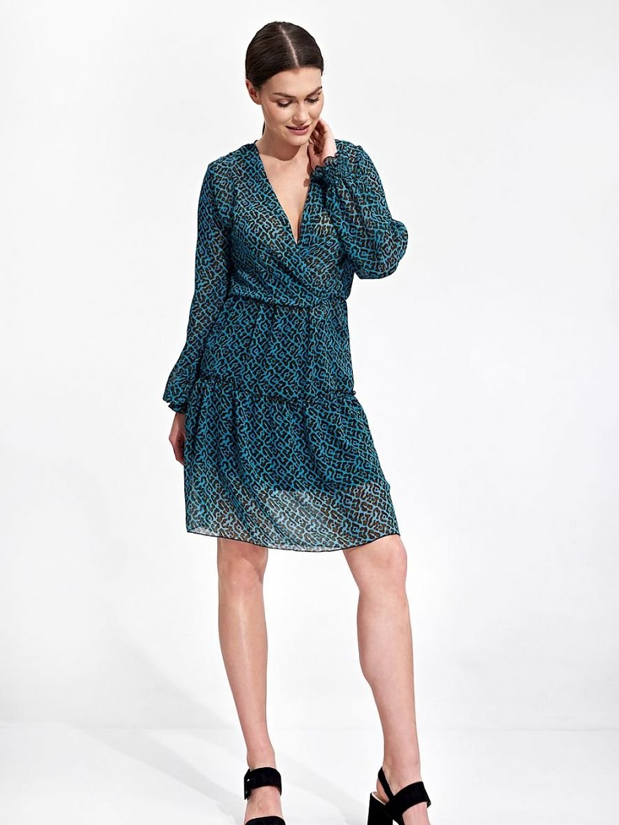 Letnia, zwiewna sukienka mini z długim rękawem zakończonym gumką. W pasie wszyta cienka gumka, kopertowy dekolt, dół spódnicy z ozdobną falbaną. Wszyta podszewka w spódnicy, bez zapięcia.