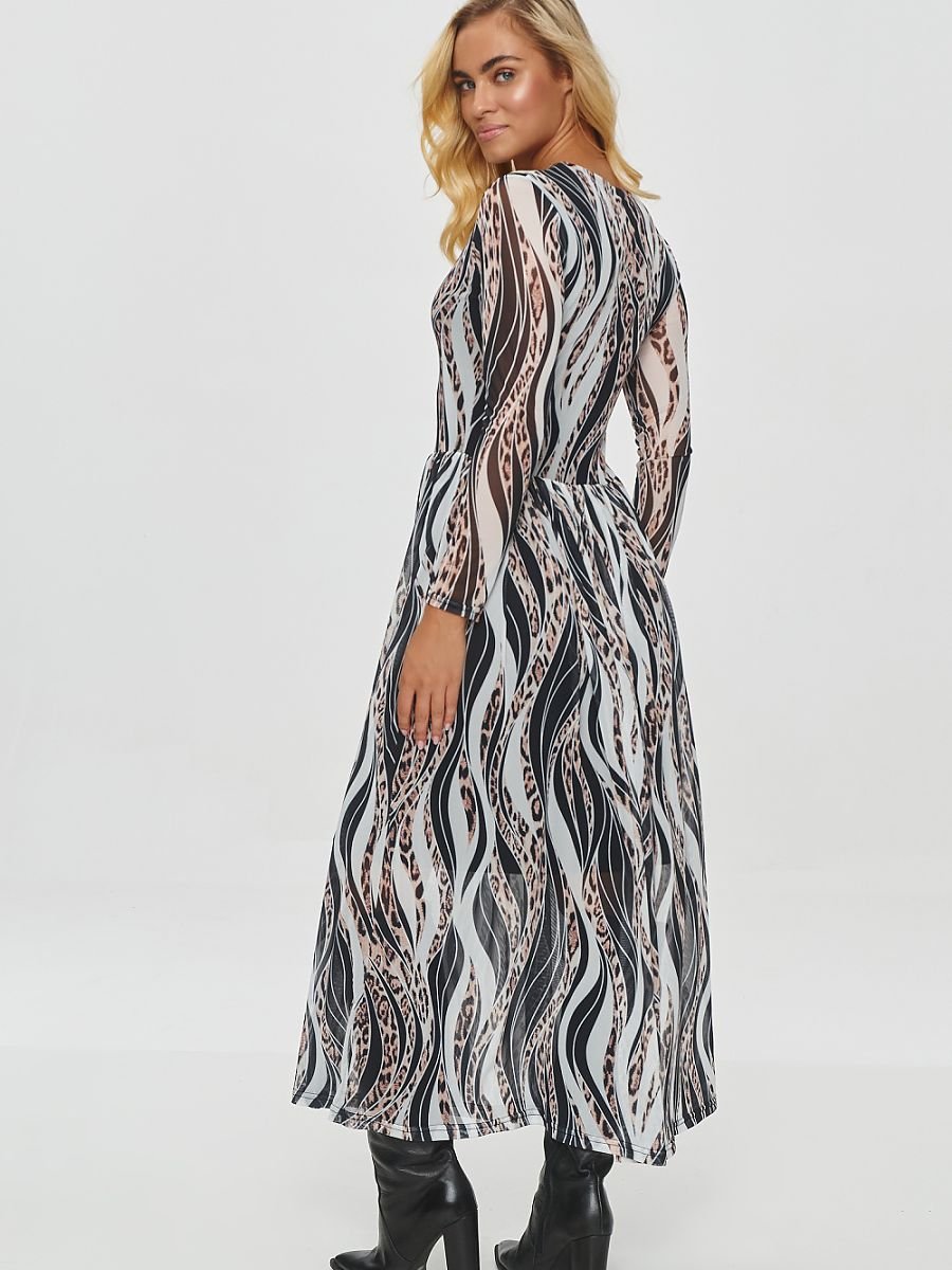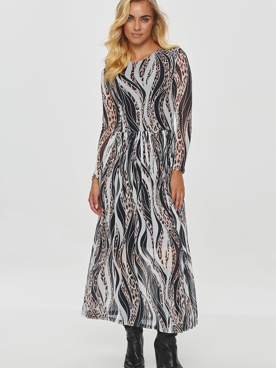 Długa printowa sukienka wykonana z lekkiego, zwiewnego materiału, który nadaje jej eleganckiego i romantycznego wyglądu. Wzór sukienki to złożona mieszanka motywów roślinnych, zwierzęcych i abstrakcyjnych, w kolorach dominujących czarnych, białych, beżowych, brązowych i odcieniach pomarańczy. Wzór jest skomplikowany i jednocześnie oryginalny dodający kreacji wyrazistego stylu. Model ma lekko dopasowaną górę, która podkreśla talię, natomiast dół jest rozkloszowany, co dodaje jej lekkości i ruchu. Wykończenie sukienki jest subtelne, a materiał jest półprzezroczysty, co podkreśla jej delikatność. Sukienka posiada wiskozową podszewkę, która dyskretnie zakrywa strategiczne miejsca i zapewnia komfort podczas noszenia. W połączeniu z ciężkimi butami za kostkę tworzy kontrast z subtelnością sukienki, nadając całości nieco bardziej casualowy wygląd. Sukienka idealnie nadaje się na jesienne lub zimowe wieczory, dzięki swoim ciepłym kolorom i długim rękawom. Kreacja jest dostępna w pięciu wariantach, różniących się kolorem i wzorem.