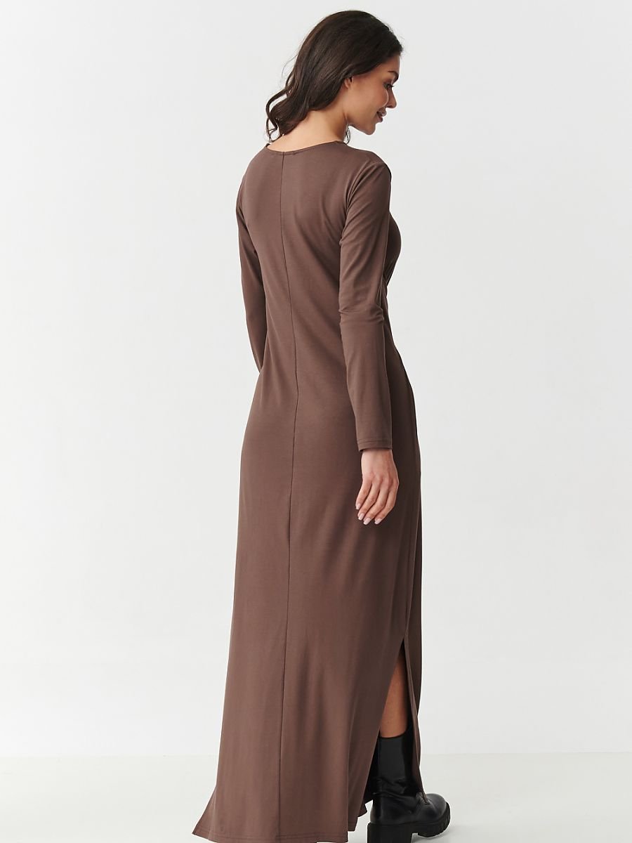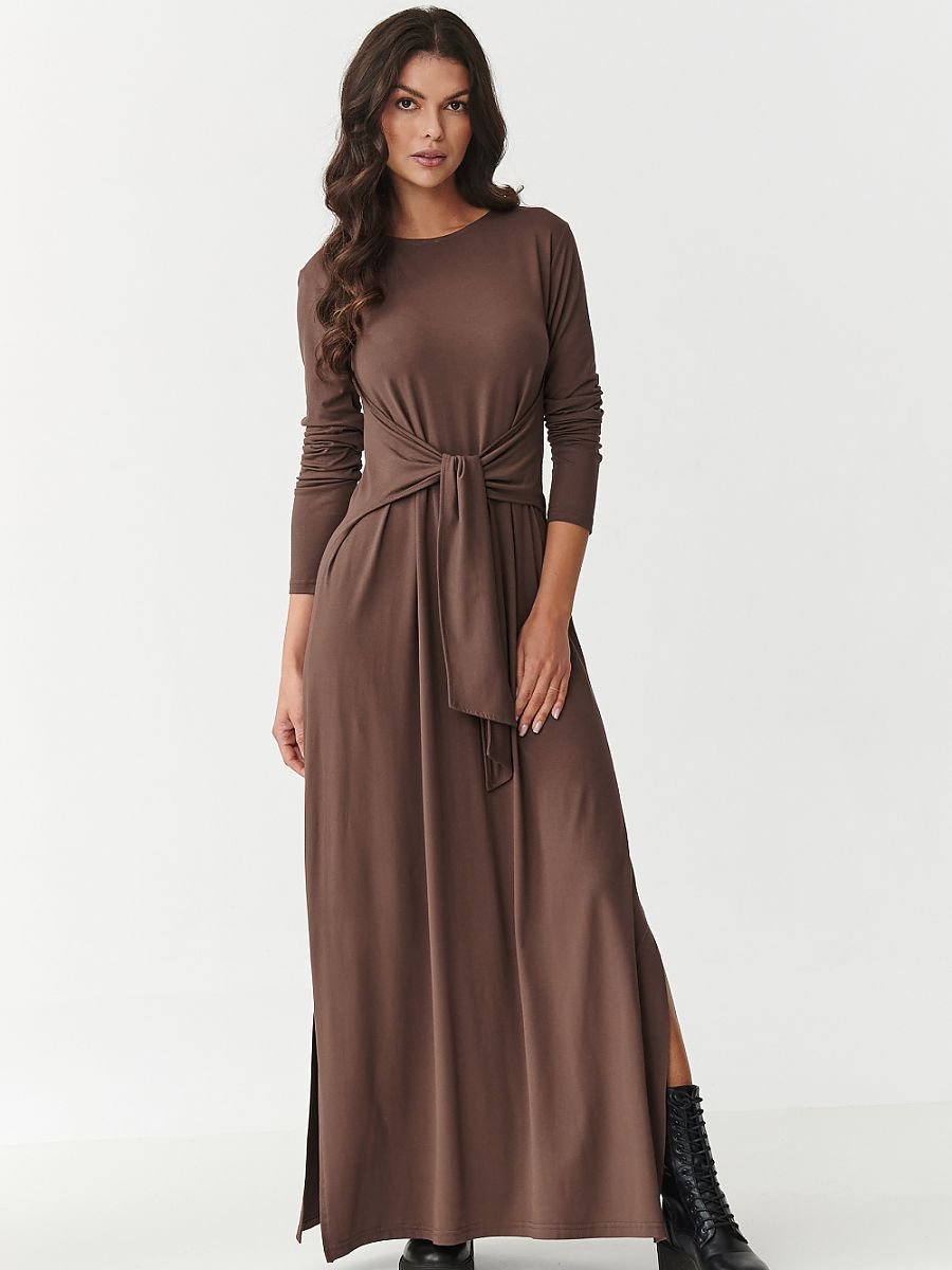 Sukienka maxi z wiskozy to połączenie wygody i ponadczasowej elegancji. Miękki, oddychający materiał sprawia, że nosi się ją wyjątkowo komfortowo przez cały dzień, a długie rękawy i efektowne wiązanie w talii pięknie podkreślają sylwetkę. Okrągły dekolt pasuje do każdego typu sylwetki i stylu. Subtelne rozcięcia po bokach nadają całości lekkości i kobiecego charakteru, jednocześnie zapewniając swobodę ruchów. To model, który doskonale sprawdzi się zarówno na co dzień, do pracy, jak i na spotkania w gronie znajomych. Wystarczy zmienić dodatki, aby nadać stylizacji bardziej casualowego albo eleganckiego charakteru. Dzięki klasycznym kolorom, antracytowym, czarnym, bordowym, khaki i czekoladowym łatwo dopasujesz ją do swojej garderoby i stworzysz wiele wyjątkowych zestawów. Sukienka maxi z wiązaniem w talii to propozycja, która łączy nowoczesny wygląd, wygodę i uniwersalność. Świetnie prezentuje się zarówno z botkami i ramoneską, jak i w duecie z eleganckimi szpilkami czy sportowymi sneakersami.