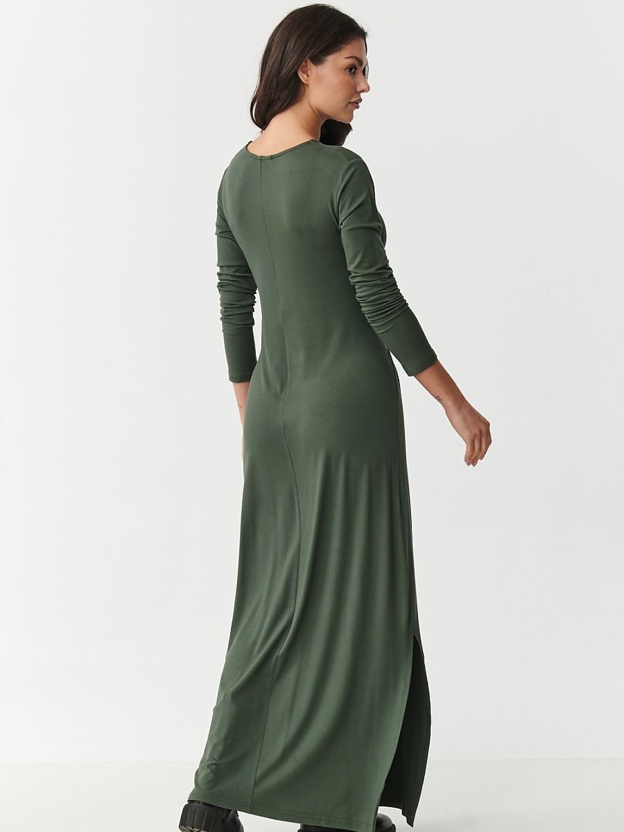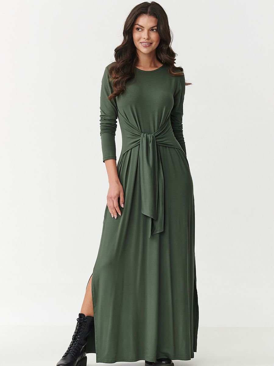Sukienka maxi z wiskozy to połączenie wygody i ponadczasowej elegancji. Miękki, oddychający materiał sprawia, że nosi się ją wyjątkowo komfortowo przez cały dzień, a długie rękawy i efektowne wiązanie w talii pięknie podkreślają sylwetkę. Okrągły dekolt pasuje do każdego typu sylwetki i stylu. Subtelne rozcięcia po bokach nadają całości lekkości i kobiecego charakteru, jednocześnie zapewniając swobodę ruchów. To model, który doskonale sprawdzi się zarówno na co dzień, do pracy, jak i na spotkania w gronie znajomych. Wystarczy zmienić dodatki, aby nadać stylizacji bardziej casualowego albo eleganckiego charakteru. Dzięki klasycznym kolorom, antracytowym, czarnym, bordowym, khaki i czekoladowym łatwo dopasujesz ją do swojej garderoby i stworzysz wiele wyjątkowych zestawów. Sukienka maxi z wiązaniem w talii to propozycja, która łączy nowoczesny wygląd, wygodę i uniwersalność. Świetnie prezentuje się zarówno z botkami i ramoneską, jak i w duecie z eleganckimi szpilkami czy sportowymi sneakersami.