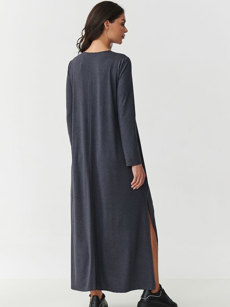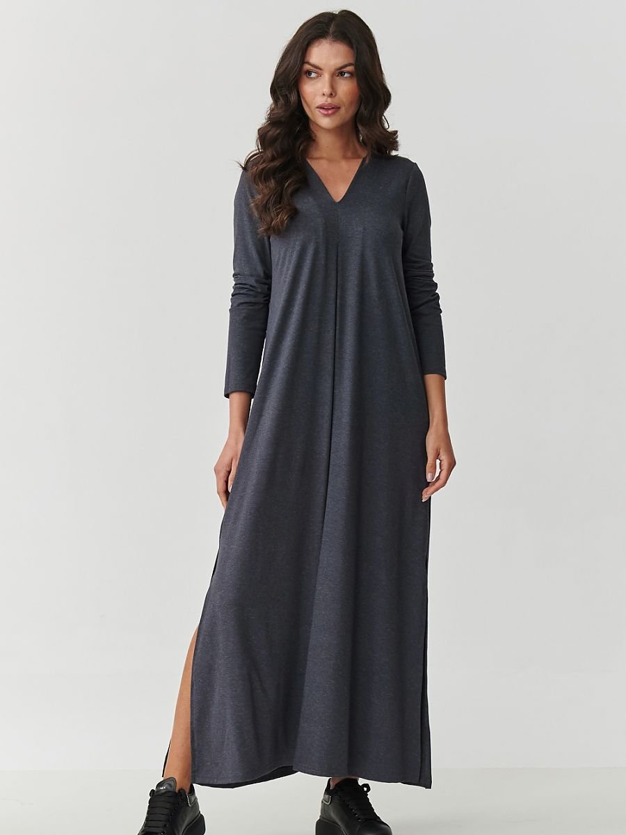 Postaw na ponadczasową klasykę i maksymalny komfort! Nasza długa sukienka maxi uszyta z wysokiej jakości wiskozy z dodatkiem elastanu to idealny wybór zarówno na co dzień, jak i na wyjątkowe okazje. Dzięki naturalnej przewiewności wiskozy oraz elastyczności tkaniny, sukienka pięknie układa się na sylwetce, nie krępując ruchów. Model posiada dekolt w literę V, który subtelnie podkreśla kobiece kształty, a lekko rozkloszowany krój z rozcięciami po bokach dodaje lekkości i nowoczesnego charakteru. Długie rękawy sprawiają, że sukienka sprawdzi się o każdej porze roku ? możesz ją nosić zarówno wiosną i latem, jak i jesienią czy zimą w połączeniu z botkami lub kozakami. Dostępna w modnych kolorach: czekoladowy- głęboki, elegancki odcień, który podkreśla urodę i dodaje klasy, czarny ? ponadczasowa klasyka, niezastąpiona w każdej garderobie, khaki ? stylowy i uniwersalny kolor w militarnym klimacie oraz antracytowy ? głęboki, ciemnoszary odcień idealny na eleganckie i casualowe stylizacje. Ta sukienka maxi to doskonały wybór dla kobiet ceniących komfort, minimalizm i elegancki styl. Świetnie wygląda zestawiona zarówno ze sportowymi sneakersami, jak i eleganckimi butami na obcasie.