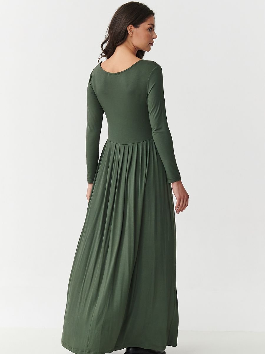 Długa sukienka o prostym, ale eleganckim kroju to doskonała propozycja dla kobiet, które szukają wygody i stylu w jednym. Wykonana z lekkiej i przewiewnej wiskozy, która zapewnia komfort przez cały dzień. Fason sukienki jest niezwykle uniwersalny i ponadczasowy, łącząc klasyczny styl z nowoczesnymi akcentami. Góra sukienki o dopasowanym kroju podkreśla sylwetkę, natomiast dół w formie luźnego, delikatnie rozkloszowanego materiału maskuje niedoskonałości oraz zapewnia swobodę ruchów i lekkość. Subtelne rozcięcie z boku nie tylko dodaje jej zmysłowego charakteru, ale również sprawia, że sukienka zyskuje dynamiczny, modny wygląd. Długie rękawy dodają elegancji i sprawiają, że sukienka jest idealna także na chłodniejsze dni. Dzięki takiemu połączeniu fasonu, sukienka pasuje do wielu okazji, od codziennych spotkań, przez wieczorne wyjścia, aż po bardziej formalne wydarzenia. Jest to propozycja, która łączy kobiecość, wygodę i nowoczesność, sprawdzając się w różnych stylizacjach i okolicznościach.