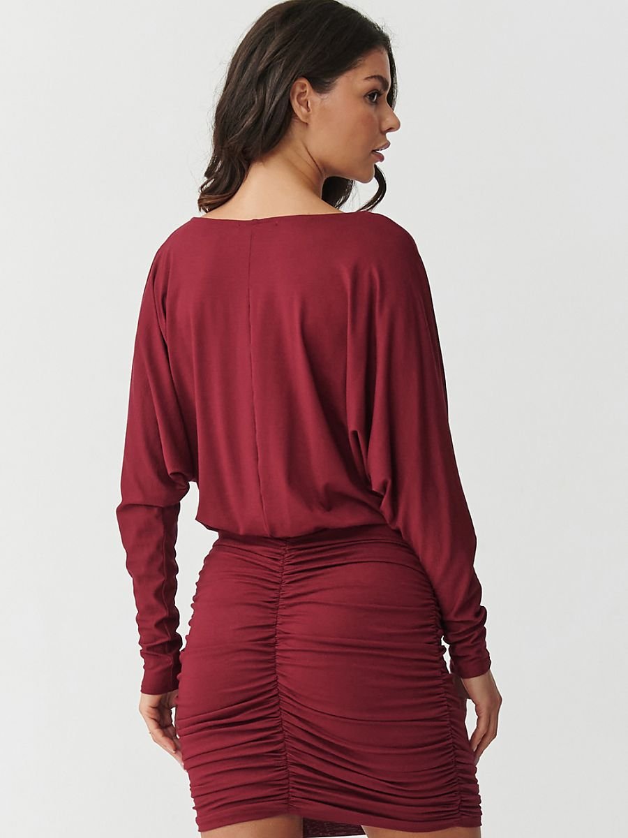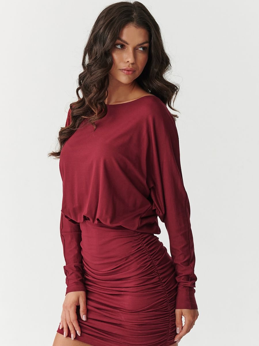 Ta sukienka mini łączy w sobie wygodę i kobiecą elegancję. Jej wyjątkowy krój z luźną górą i dopasowanym dołem tworzy efektowną sylwetkę, podkreślając talię i eksponując nogi. To idealna propozycja dla kobiet, które cenią modny wygląd i komfort w jednym. Dzięki marszczeniom po bokach sukienka doskonale modeluje sylwetkę, dodając jej lekkości i zmysłowego charakteru. Luźna góra z długim rękawem zapewnia swobodę i subtelny, elegancki efekt oraz skutecznie maskuje niedoskonałości a dopasowany dół sprawia, że całość prezentuje się niezwykle kobieco i nowocześnie. Uniwersalny fason pozwala na różnorodne stylizacje ? sukienka świetnie sprawdzi się w połączeniu ze szpilkami na wieczorne wyjścia, a w zestawie z botkami lub kozakami zyskuje bardziej casualowy, miejski charakter. To model nadający się na imprezę, randkę, spotkanie ze znajomymi, ale również na eleganckie przyjęcie. Jeśli szukasz sukienki mini, która łączy w sobie wygodę, styl i ponadczasową kobiecość, ten model z marszczeniem i luźną górą będzie idealnym wyborem.