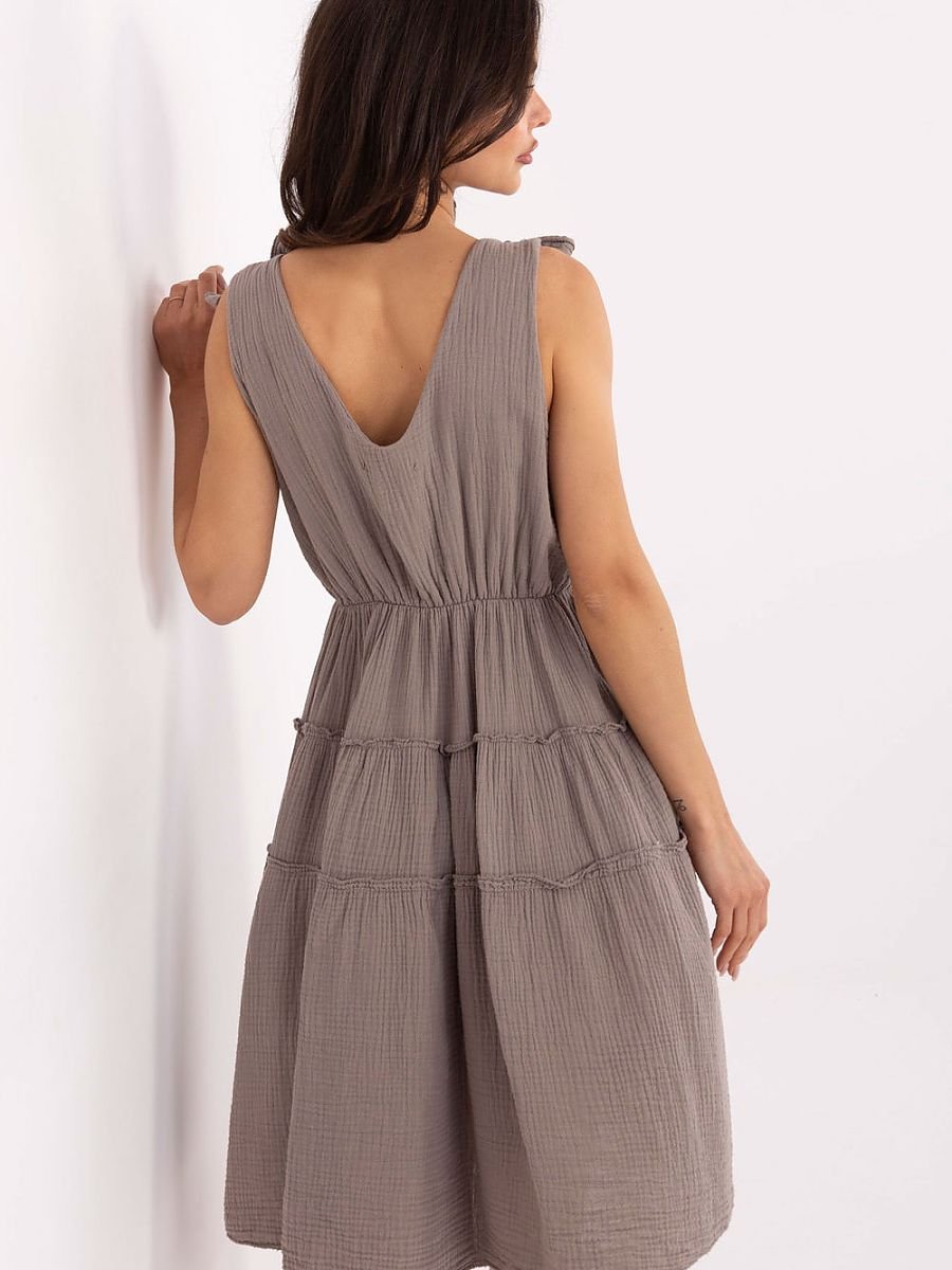 Letnia muślinowa sukienka o rozkloszowanym fasonie to lekka i przewiewna propozycja na codzienne stylizacje. Wykonana z miękkiej, oddychającej bawełny, zapewnia komfort noszenia w ciepłe dni. Gładka tkanina oraz prosty krój sprawiają, że sukienka prezentuje się kobieco i naturalnie. Model sięga za kolano i posiada okrągły dekolt, który delikatnie podkreśla linię szyi. Ramiączka są wiązane, co pozwala na indywidualne dopasowanie i dodaje uroku całej stylizacji. Sukienka nie posiada zapięcia, jest zakładana przez głowę, co podkreśla jej swobodny, casualowy charakter. Idealna na spacery, zakupy czy letnie spotkania.