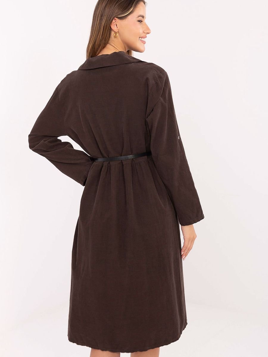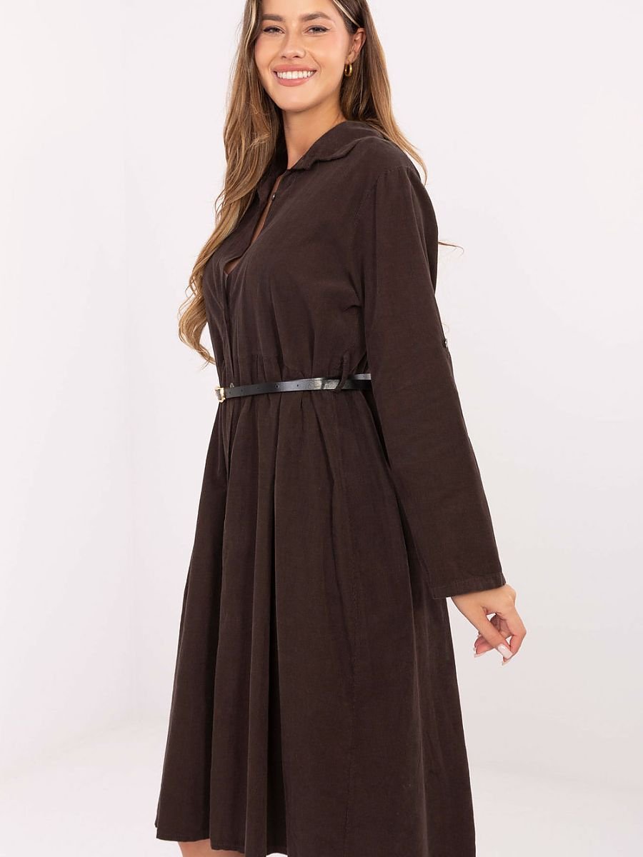 Klasyczna i stylowa sukienka koszulowa o rozkloszowanym fasonie to doskonały wybór na co dzień oraz do pracy. Wykonana z wysokiej jakości bawełny, jest przewiewna, wygodna i przyjemna w noszeniu. Model o długości midi ma długie rękawy, kołnierzyk oraz zapięcie na guziki, co nadaje mu eleganckiego, a zarazem casualowego charakteru. W talii znajduje się zapinany pasek, który pięknie podkreśla sylwetkę i pozwala dopasować sukienkę do figury. Gładki wzór sprawia, że to ponadczasowy element garderoby, który z łatwością zestawisz zarówno z eleganckimi butami do pracy, jak i z obuwiem na płaskiej podeszwie w codziennych stylizacjach.