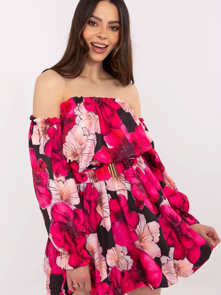 Stylowa sukienka letnia o rozkloszowanym fasonie, idealna na codzienne oraz wizytowe okazje. Wykonana z połączenia poliestru, wiskozy i elastanu, zapewnia komfort noszenia i lekkość, idealną na cieplejsze dni. Kwiatowy wzór dodaje jej kobiecego uroku i świeżości, tworząc wyjątkowy, romantyczny look. Sukienka ma długość mini, długie bufiaste rękawy oraz dekolt w stylu hiszpanki, który pięknie eksponuje ramiona. Dodatkowym atutem jest zapinany pasek, który umożliwia podkreślenie talii i dopasowanie sukienki do sylwetki. Wnętrze sukienki wykończone jest podszewką, co zwiększa komfort noszenia. Brak zapięcia sprawia, że sukienka jest łatwa do założenia. Idealna na letnie dni, zarówno na co dzień, jak i na bardziej formalne wydarzenia, łącząc wygodę z elegancją.