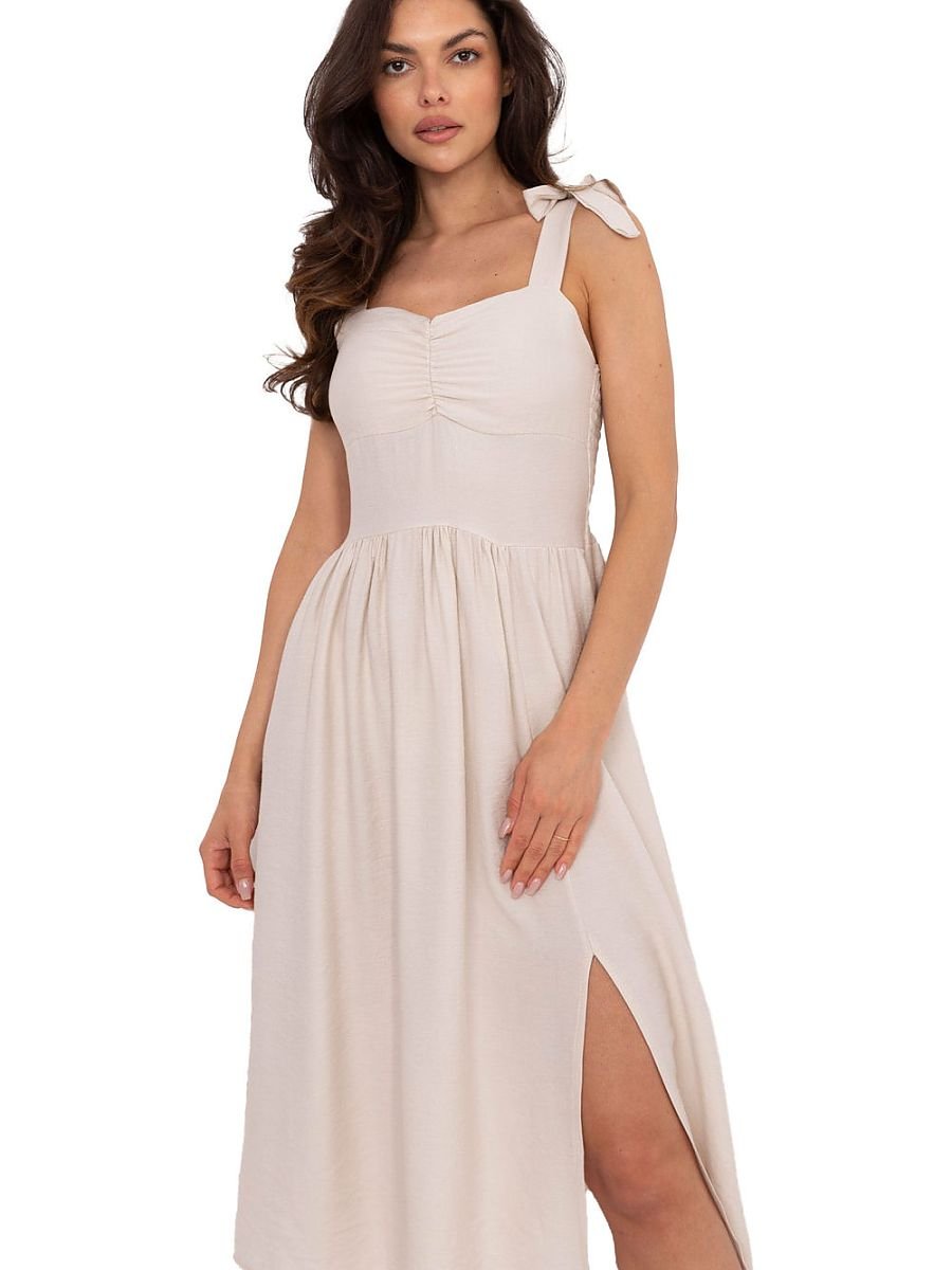 Lekka i dziewczęca ta letnia sukienka to idealna propozycja na ciepłe, codzienne dni. Wykonana z przewiewnej mieszanki wiskozy i nylonu, zapewnia komfort noszenia i delikatne układanie się materiału. Posiada rozkloszowany fason, który pięknie podkreśla talię i nadaje sylwetce lekkości. Wiązane ramiączka pozwalają na regulację długości, a dekolt w kształcie serca z subtelnym marszczeniem dodaje całości romantycznego uroku. Z tyłu sukienka została wykończona elastycznymi marszczeniami z gumkami, które dopasowują się do sylwetki, zapewniając wygodę i lepsze dopasowanie. Brak zapięcia sprawia, że model jest łatwy do zakładania. Długość za kolano i gładki wzór sprawiają, że sukienka jest uniwersalna i idealna zarówno na spacer, zakupy, jak i letnie spotkania w gronie przyjaciół.