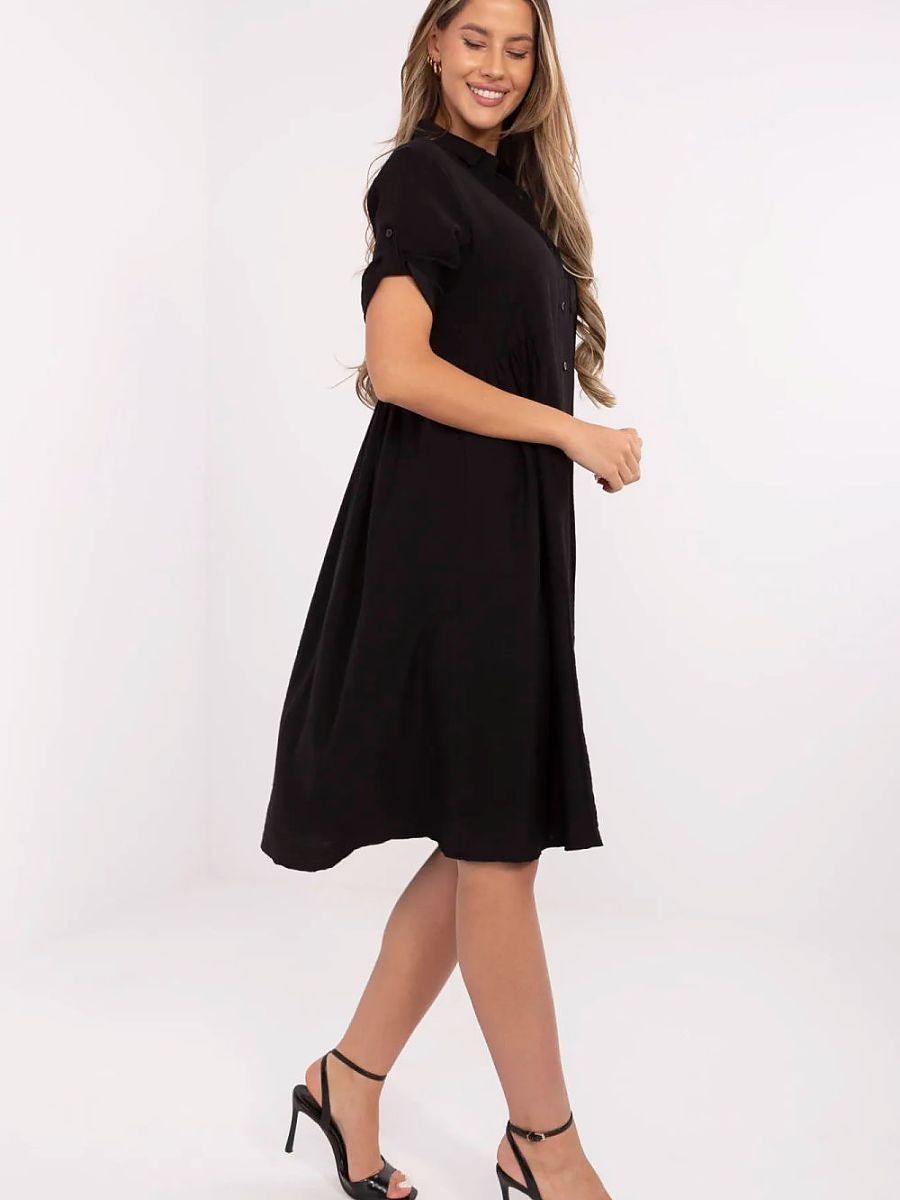 Rozkloszowana sukienka koszulowa o długości midi, stworzona z myślą o codziennym komforcie i stylu. Wykonana z lekkiej mieszanki wiskozy i nylonu, zapewnia przewiewność i subtelny połysk. Gładka tkanina podkreśla jej uniwersalny charakter, idealna zarówno do pracy, jak i na luźniejsze spotkania. Sukienka posiada klasyczny kołnierzyk, krótkie rękawy oraz zapięcie na guziki. Ozdobne marszczenia dodają jej kobiecego uroku, a praktyczna kieszonka na piersi przełamuje prostą formę. Doskonała propozycja na każdą okazję, gdy chcesz wyglądać swobodnie, a zarazem elegancko.
