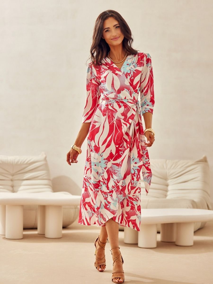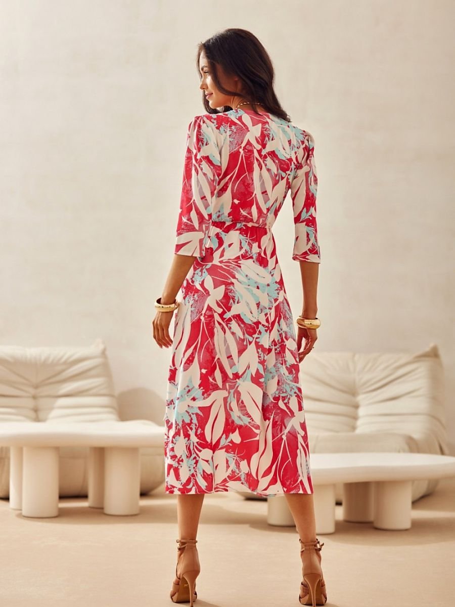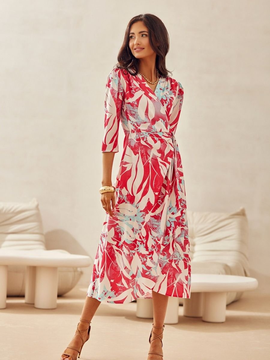 Sukienka Mirella to elegancka propozycja, która łączy kobiecy szyk z funkcjonalnym designem. Model o długości midi został uszyty z lekkiej, przyjemnej w dotyku tkaniny zdobionej modnymi, delikatnymi wzorami, które dodają stylizacji subtelnego uroku. Zakładany dekolt w kształcie litery V optycznie wydłuża szyję i eksponuje obojczyki, a idealnie dopracowany krój tuszuje ewentualne niedoskonałości sylwetki. Szczególną uwagę przyciąga podwójne wiązanie w talii, które pozwala idealnie dopasować sukienkę do figury, modelując kobiece kształty i podkreślając proporcje. Rękawy o długości 3/4 nadają całości lekkości i czynią ten fason doskonałym wyborem zarówno na cieplejsze dni, jak i sezon przejściowy. Sukienka Mirella świetnie sprawdzi się jako stylizacja na wesele, przyjęcie lub każdą okazję, kiedy chcesz wyglądać elegancko i czuć się swobodnie. Zestawiona z klasycznymi szpilkami i biżuterią stworzy pełen wdzięku, szykowny look, który z pewnością przyciągnie spojrzenia. Produkt jest zaprojektowany i uszyty w Polsce.