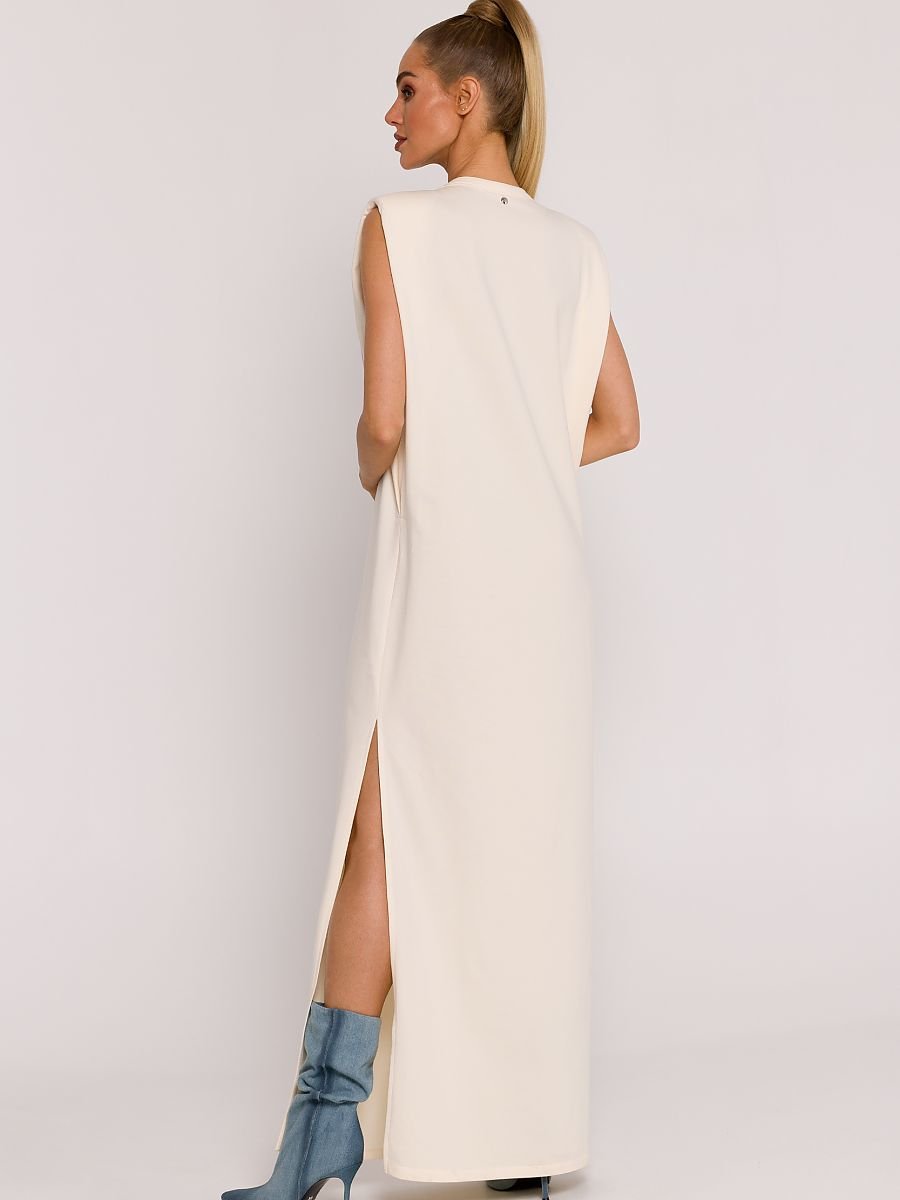 Ta sukienka z dzianiny to wyraz luksusu i wyjątkowej polskiej krawiectwa, gdzie dbałość o detale i wygodę spotykają się w jednym projekcie. Zaprojektowana i uszyta w Polsce, reprezentuje unikalny styl i komfort noszenia. Sukienka typu oversize jest doskonałą propozycją dla kobiet, które cenią sobie swobodę ruchu, nie rezygnując jednocześnie z elegancji. Jej fason, zakładany przez głowę, sprawia, że noszenie jej staje się niezwykle łatwe i komfortowe. Rozcięcie na boku dodaje sukience lekkości i subtelnej zmysłowości. Bezrękawnikowy design sukienki, wsparty poduszkami na ramionach, nadaje całej stylizacji nowoczesności i unikalnego charakteru. Poduszki na ramionach dodają struktury, podkreślając jednocześnie wyjątkowy kształt sukienki. Długość maxi sprawia, że sukienka nadaje się zarówno na eleganckie wyjścia, jak i na bardziej casualowe okazje. Dekoracyjna logowana blaszka umieszczona z tyłu to nie tylko element designerski, ale również subtelny akcent wzbogacający cały projekt. Staranne wykonanie blaszki podkreśla wysoką jakość sukienki. Dodatkowo, brak podszewki sprawia, że sukienka jest przewiewna i lekka, idealna na cieplejsze dni. Ta sukienka z dzianiny to nie tylko ubranie, ale wyraz polskiej tradycji krawieckiej, łączący w sobie elegancję, komfort i unikalny design. Idealna dla kobiet, które pragną wyrazić siebie poprzez modę, podkreślając swój indywidualny styl.