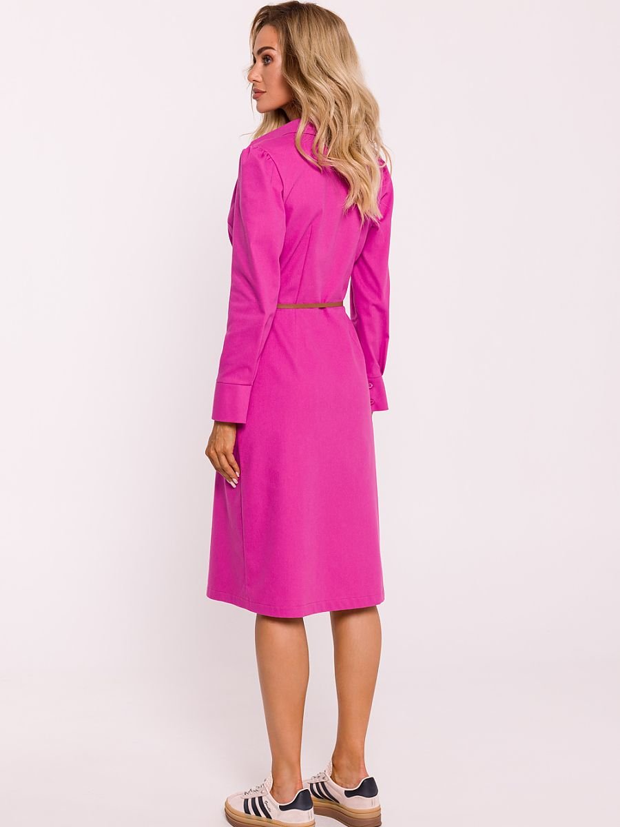 Sukienka o koszulowym fasonie, wykonana z wysokiej jakości tkaniny bawełnianej. Model z klasycznym kołnierzykiem, z przodem rozpinanym na całej długości, co dodaje jej uniwersalności i stylu. Długie rękawy zakończone mankietami, zapinanymi na dwa guziki, podkreślają elegancki charakter sukienki. Długość za kolano oraz dołączony pasek pozwalają na indywidualne dopasowanie do sylwetki. Sukienka bez podszewki, lekka i przewiewna. Zaprojektowana i uszyta w Polsce, łączy w sobie komfort i styl, idealna na różne okazje.