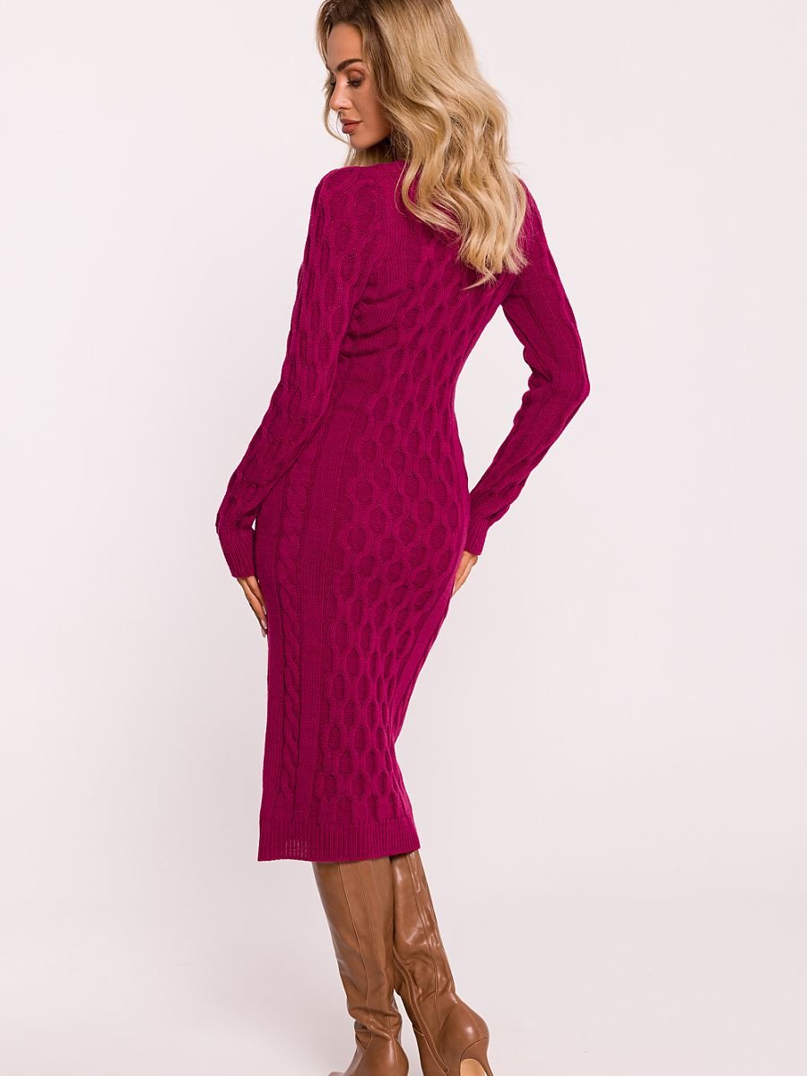 Sukienka swetrowa o dopasowanym fasonie, wykonana z przędzy o różnorodnym splocie, która nadaje jej unikalną fakturę i miękkość. Posiada długi rękaw oraz dekolt w kształcie litery V, podkreślający szyję i dodający elegancji. Długość midi zapewnia komfort i wszechstronność, idealna na różne okazje. Całość została zaprojektowana i uszyta w Polsce, co gwarantuje wysoką jakość wykonania oraz dbałość o detale.