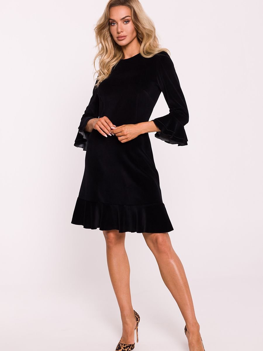 Urocza sukienka wykonana z dzianiny welurowej, łącząca komfort z eleganckim stylem. Odcinana w pasie, idealnie podkreśla sylwetkę, a dekolt pod szyję nadaje jej klasycznego charakteru. Długie rękawy o długości 7/8 zakończone falbankami dodają całości subtelnego uroku i dziewczęcego wdzięku. Dół sukienki również wykończony falbaną, wprowadza lekkość i ruch, a długość przed kolano sprawia, że jest to idealna propozycja na różne okazje. Kryty zamek z tyłu zapewnia wygodne zapięcie, a brak podszewki sprawia, że sukienka jest lekka i komfortowa w noszeniu. Zaprojektowana i uszyta w Polsce, to doskonały wybór dla kobiet, które cenią sobie połączenie modnego wyglądu z wygodą na co dzień.