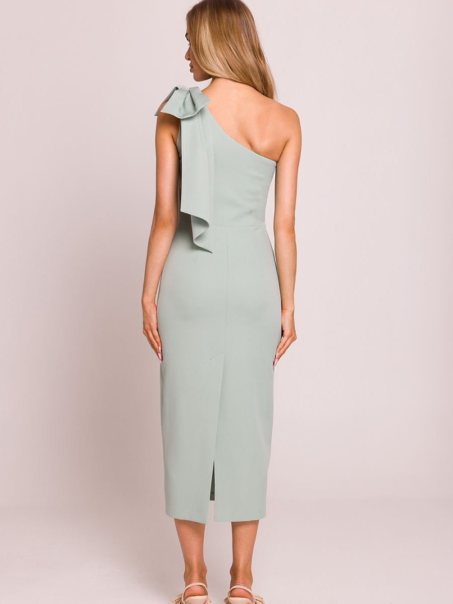 Elegancka sukienka midi o ołówkowym fasonie, podkreślająca kobiecą sylwetkę. Model zachwyca asymetrycznym krojem z motywem na jedno ramię, ozdobionym efektowną kokardą, która dodaje szyku i wyjątkowego charakteru. Wysokie rozcięcie z tyłu subtelnie eksponuje nogę, nadając kreacji lekkości i zmysłowości. Sukienka zapinana jest na boku na kryty zamek, co zapewnia idealne dopasowanie. Częściowa podszewka gwarantuje komfort noszenia. Zaprojektowana i uszyta w Polsce z dbałością o każdy detal.
